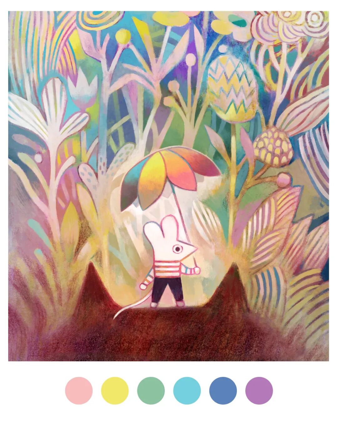 粉彩画风最特别的一点就是颜色非常丰富,我们的画面中房子块面非常多,可以很好做出画面缤纷的效果。但是我们在上色的时候如果一上来就一顿操作,各种颜色都用到,那么画面一定会乱。所以接下来给大家介绍一下我的配色方法: