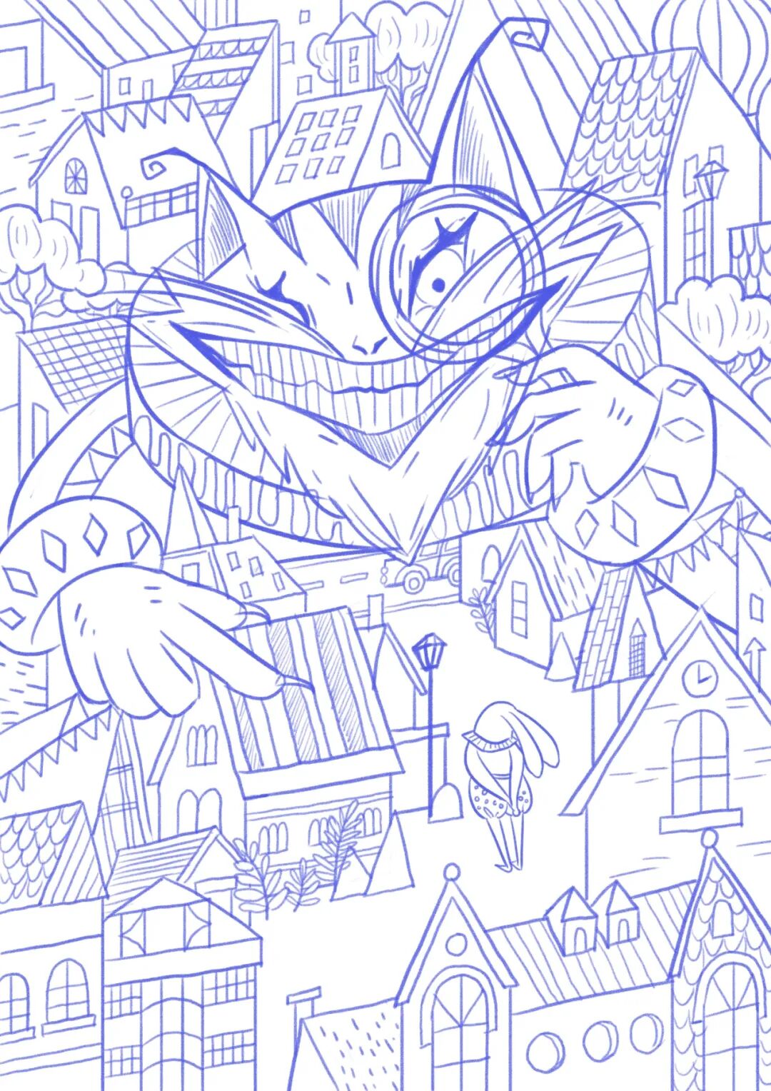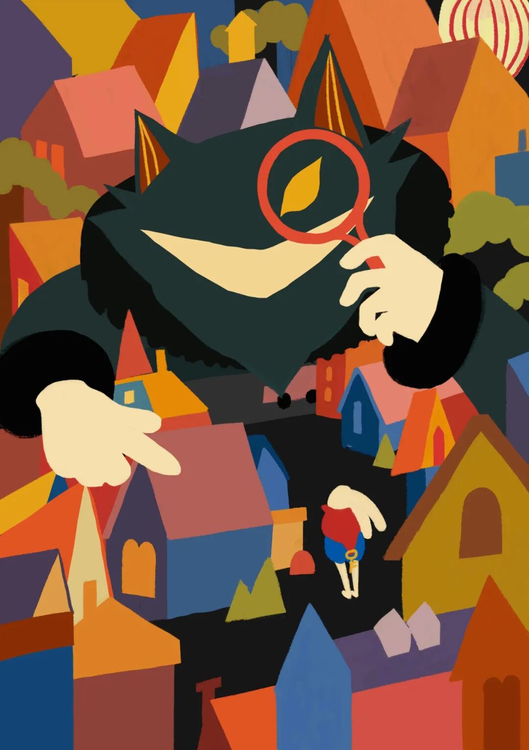 结合关键词我联想到的故事是兔子从猫咪身上偷了钥匙,在城市的巷子里逃跑被发现的场景,猫咪作为比较庞大的形象出现,兔子作为比较弱小的形象出现。