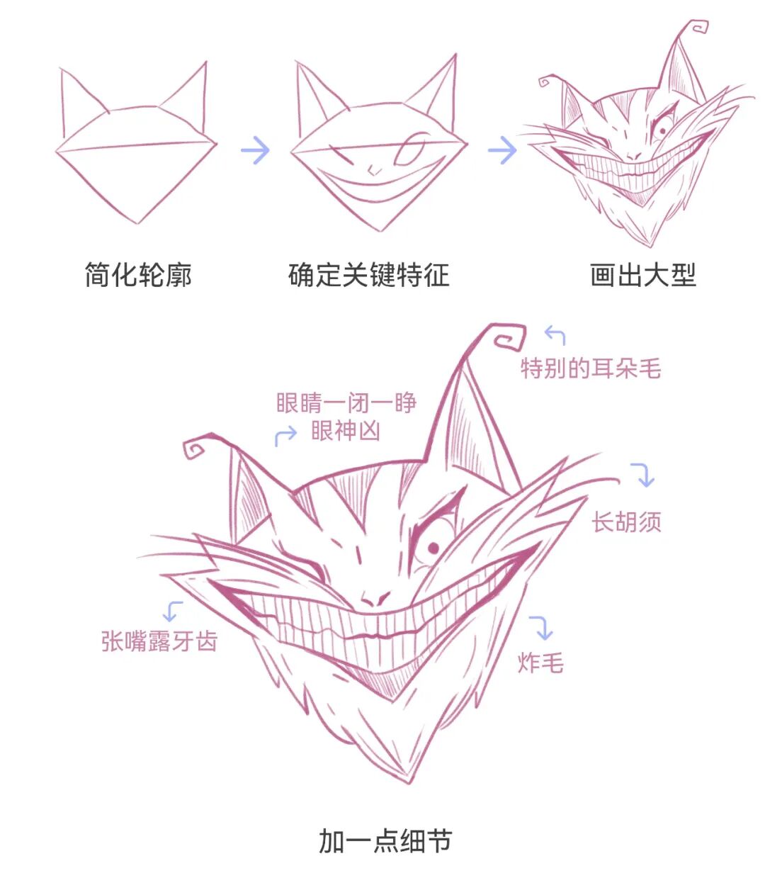 3. 绘制五官:在轮廓的基础上绘制五官,并强化猫咪的局部特征。