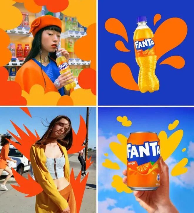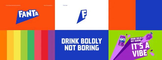 视觉图形方面新LOGO既继承了「芬达」品牌重要的视觉资产,蓝色的背景板变的更加尖锐,构建了一个更加灵活自由,独特个性的「芬达」世界。