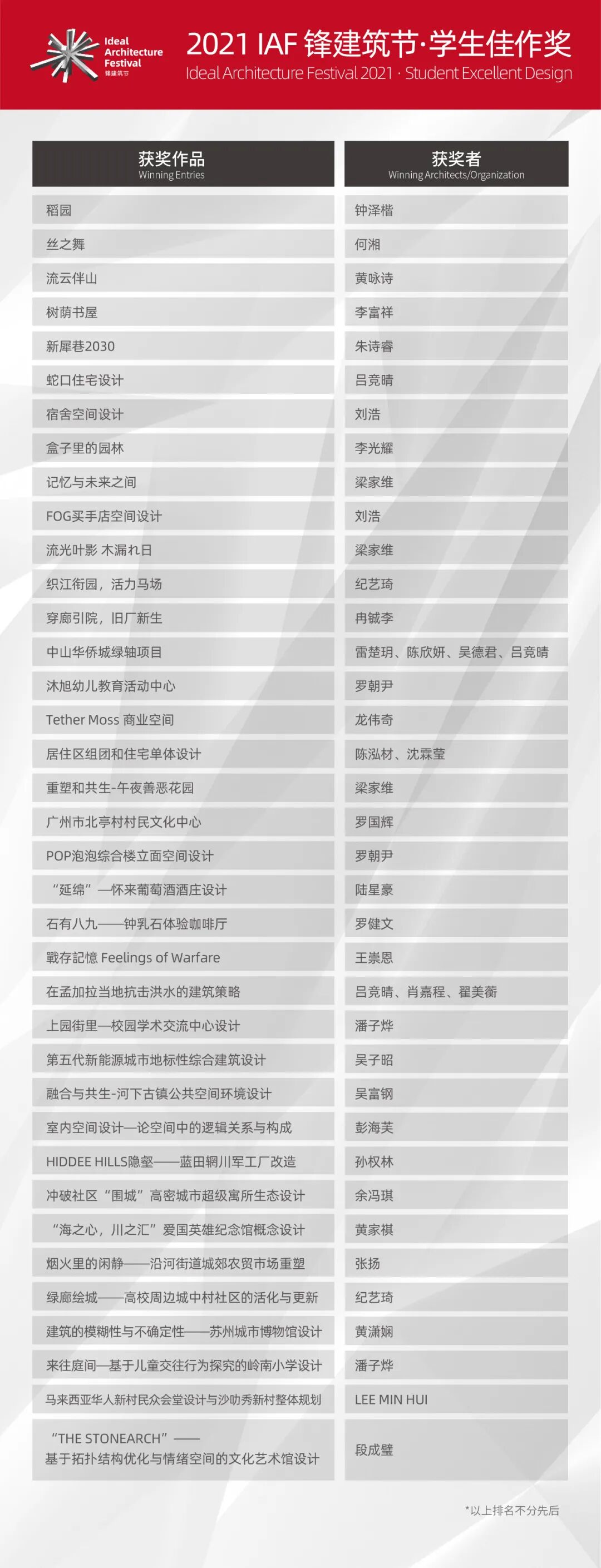 每位荣获学生佳作奖的参评学生均可申请在【我与我的未建成】2021IAF锋建筑节梦想发布会上讲演获奖作品,申请成功后,组委会将以书面形式通知,演讲名额有限,欢迎大家踊跃报名!