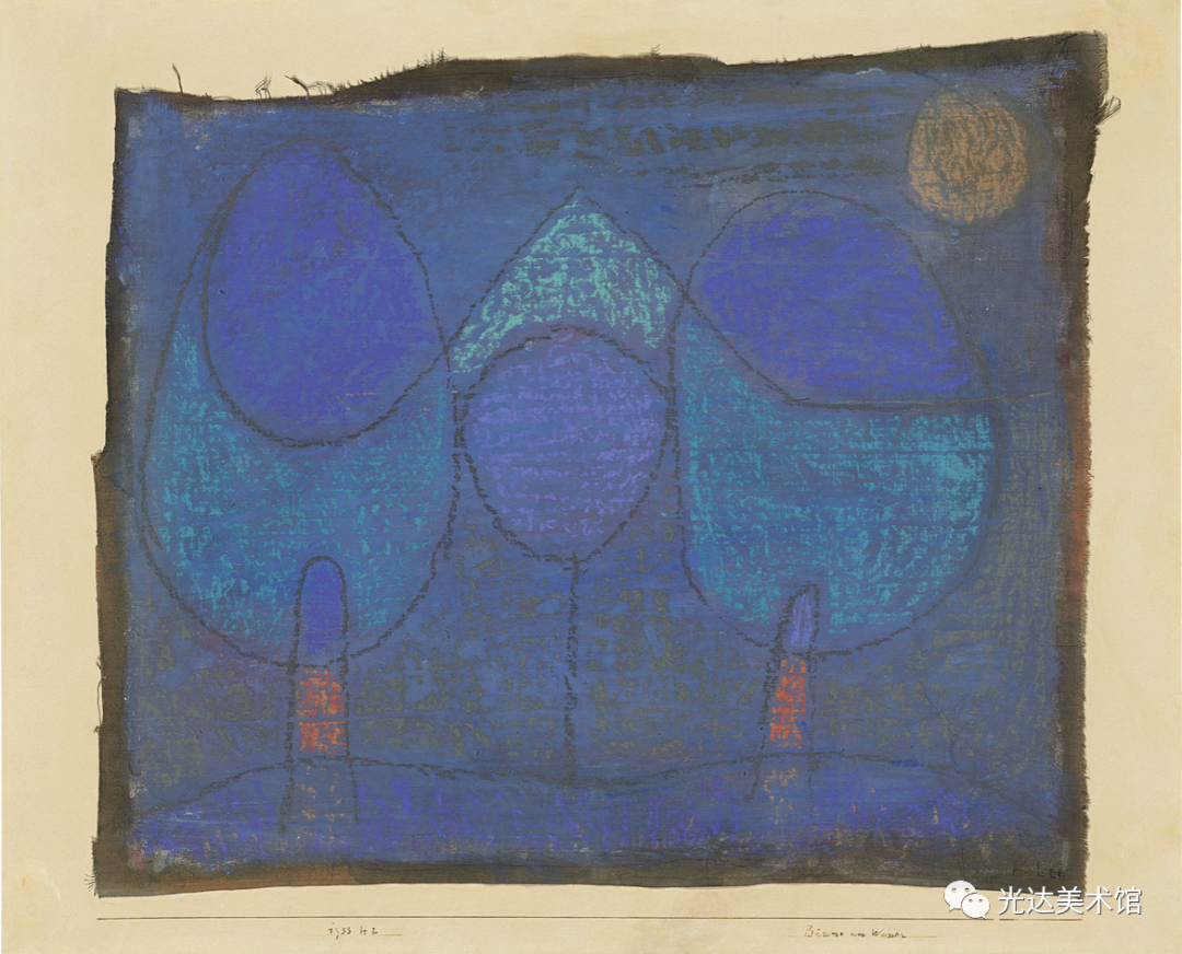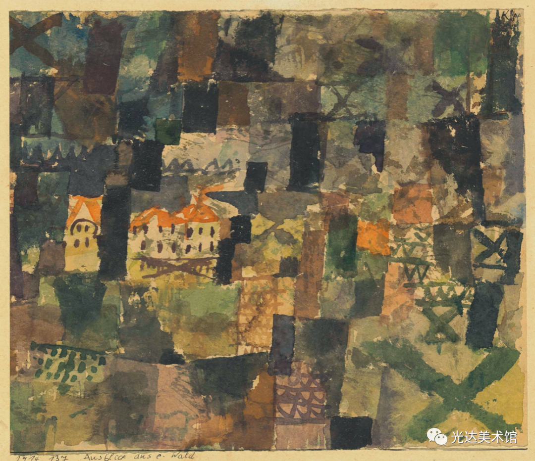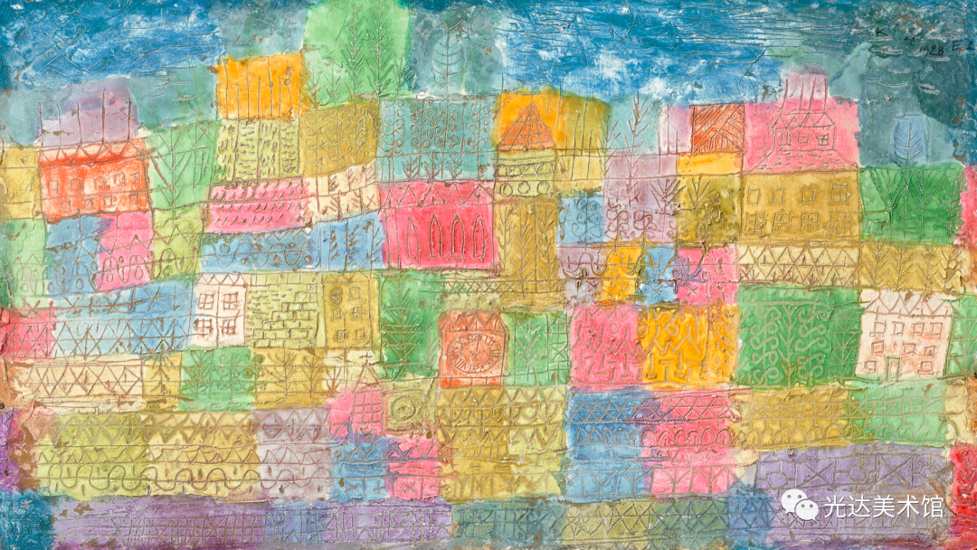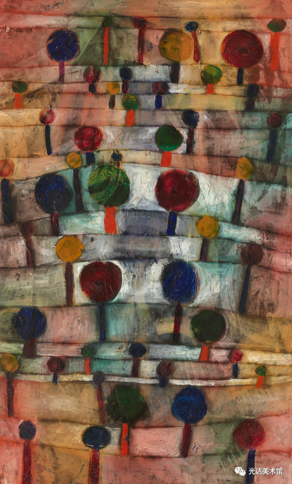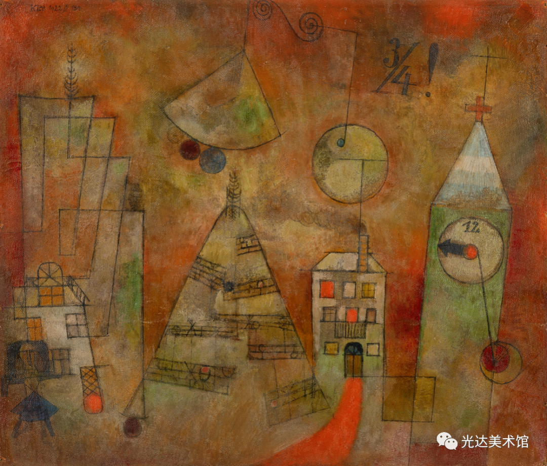 然而,克利不仅使源起呈现在他的作品中,他还意识到,在这样的艺术作品中,源起既在艺术家也在观者身上实现。作品就是源起,或者用克利的表达,“源起作为形式的运动就是作品的本质(das Wesentliche am Werk)”[14]。作为本源的源起,作品是种运动,而且从未仅仅作为一个产品被经历。运动使作品存在:“火焰燃烧起来,传导过双手,流淌在画上,然后迸现火花,圆圈在起始处终结:回到双眼中或更远的地方。”同样,在观赏者那里也有运动存在:作品中展开的道路是为了让观众的目光来追随,同时也可以让观众审查画面的不同部位。作品本身从这两个方面确定了本属于它的运动:“绘画作品来自运动,它就是固定了的运动,并在运动中被理解。”[15]因此,作品有它自身独特的时间性。[16] 在《论现代艺术》中,克利向艺术家提出一项任务——这当然首先是他自己的目标——即探究隐藏在可见形态之后的东西。艺术家会努力“接近那片隐秘的土壤,在那里,原初的律法做养所有的成长发育”。艺术家甚至会努力超越这些成长和可见形式的源起,以便“让自然的摇篮和掌握着切事物秘钥的创造的本根都变得可见”[17]。艺术因此成为创造的一个比喻。同时,在它退回到创造的本根时,在艺术的媒介中就发生了哲学家在思想中所实行的同样的回撇。因此,就像克利所说,艺术家“尽管不是十分情愿,却很可能是一位哲学家”[18]。