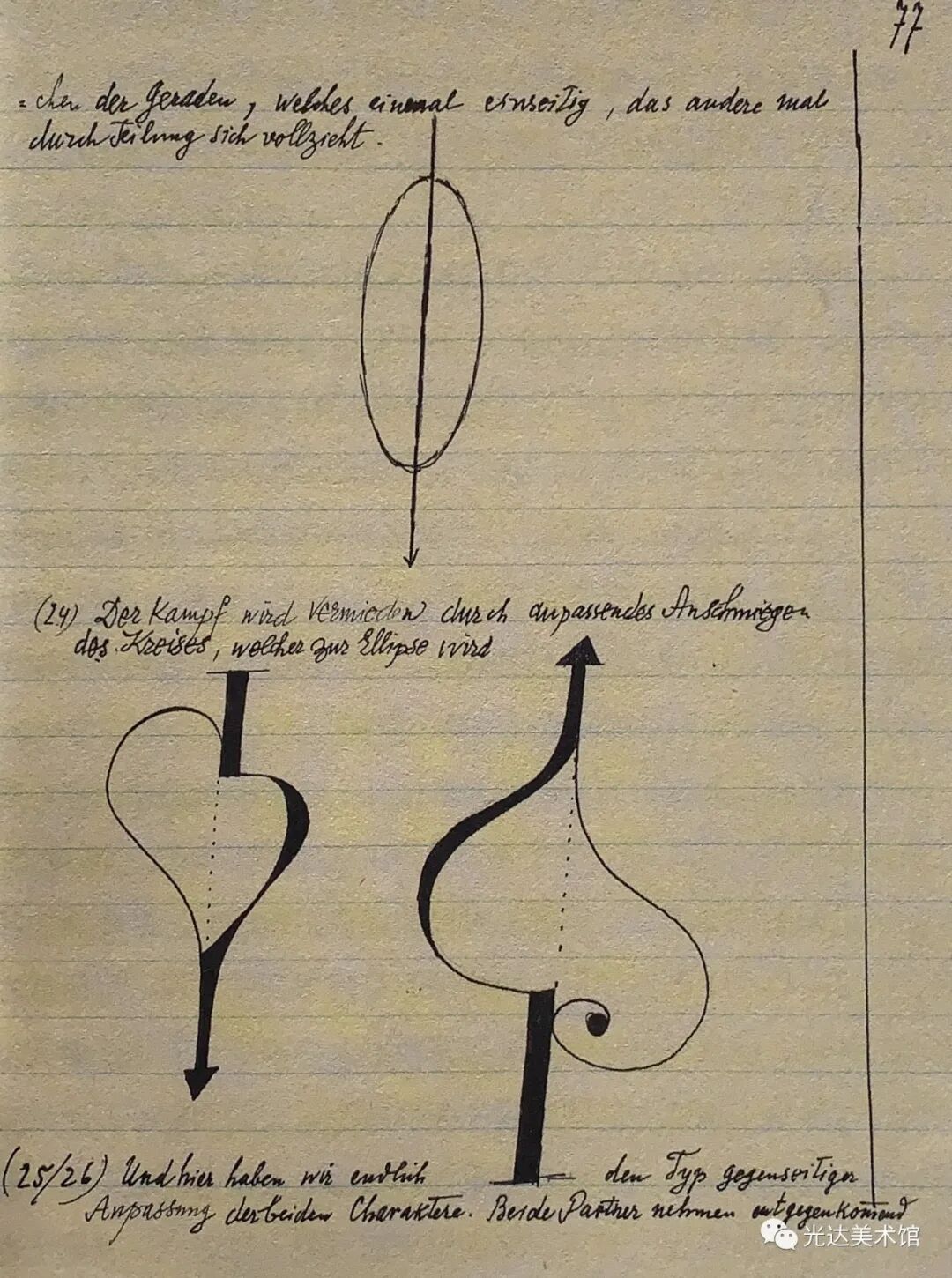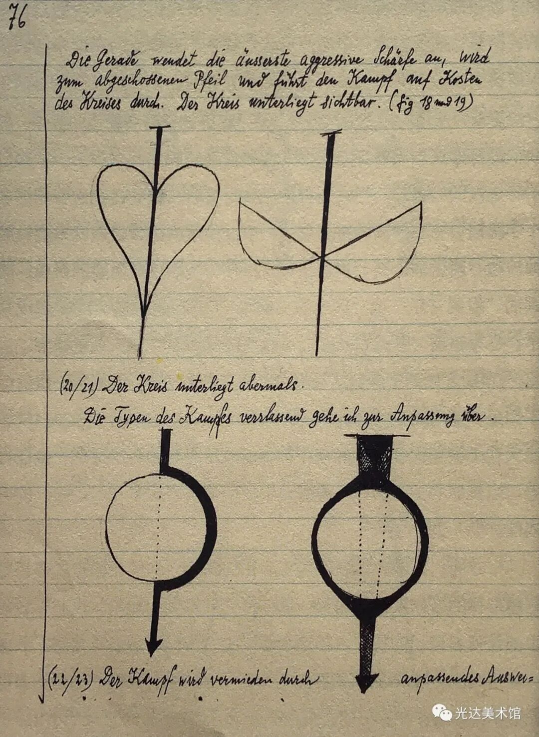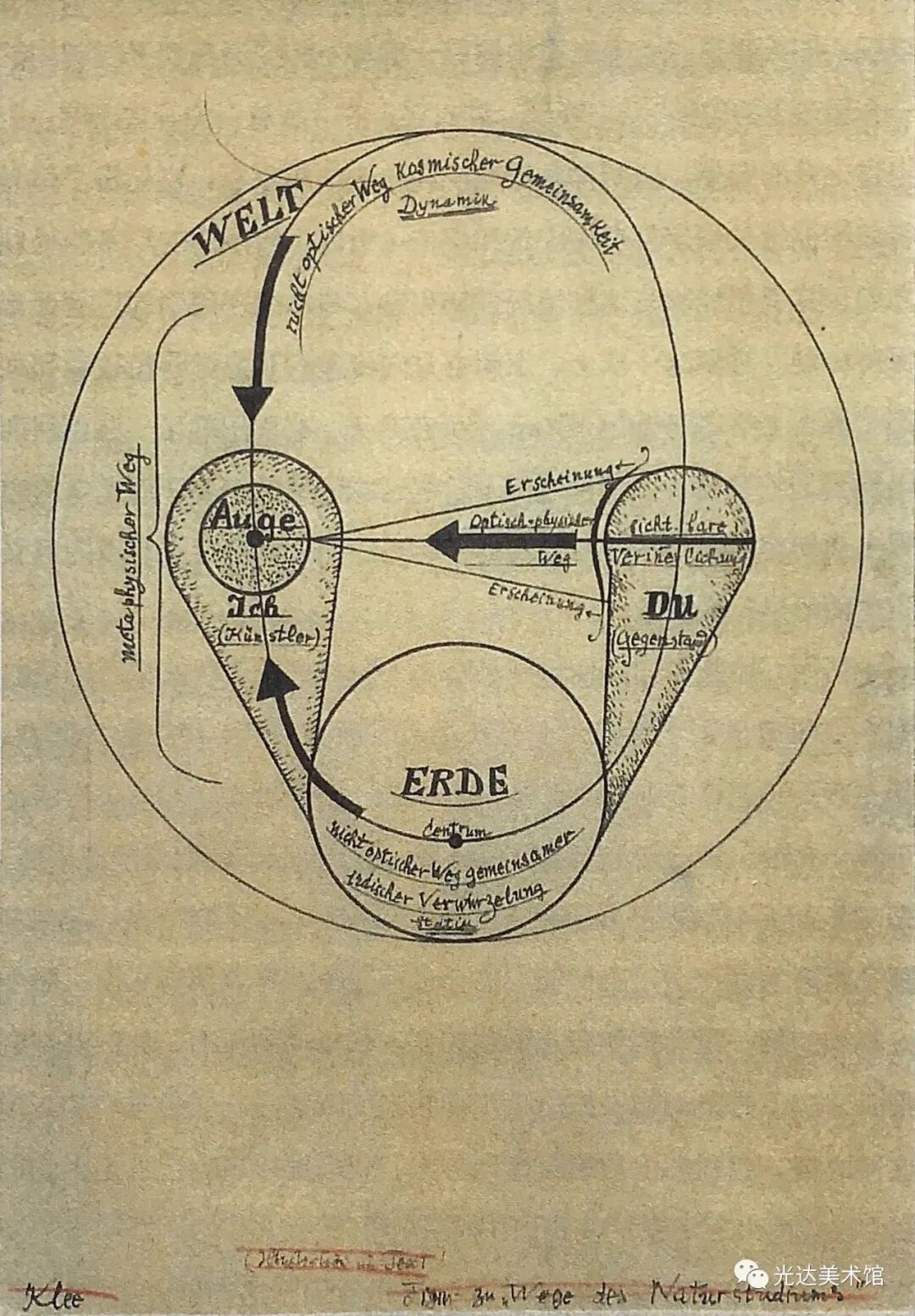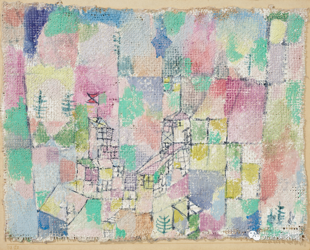 然而,克利不仅使源起呈现在他的作品中,他还意识到,在这样的艺术作品中,源起既在艺术家也在观者身上实现。作品就是源起,或者用克利的表达,“源起作为形式的运动就是作品的本质(das Wesentliche am Werk)”[14]。作为本源的源起,作品是种运动,而且从未仅仅作为一个产品被经历。运动使作品存在:“火焰燃烧起来,传导过双手,流淌在画上,然后迸现火花,圆圈在起始处终结:回到双眼中或更远的地方。”同样,在观赏者那里也有运动存在:作品中展开的道路是为了让观众的目光来追随,同时也可以让观众审查画面的不同部位。作品本身从这两个方面确定了本属于它的运动:“绘画作品来自运动,它就是固定了的运动,并在运动中被理解。”[15]因此,作品有它自身独特的时间性。[16] 在《论现代艺术》中,克利向艺术家提出一项任务——这当然首先是他自己的目标——即探究隐藏在可见形态之后的东西。艺术家会努力“接近那片隐秘的土壤,在那里,原初的律法做养所有的成长发育”。艺术家甚至会努力超越这些成长和可见形式的源起,以便“让自然的摇篮和掌握着切事物秘钥的创造的本根都变得可见”[17]。艺术因此成为创造的一个比喻。同时,在它退回到创造的本根时,在艺术的媒介中就发生了哲学家在思想中所实行的同样的回撇。因此,就像克利所说,艺术家“尽管不是十分情愿,却很可能是一位哲学家”[18]。