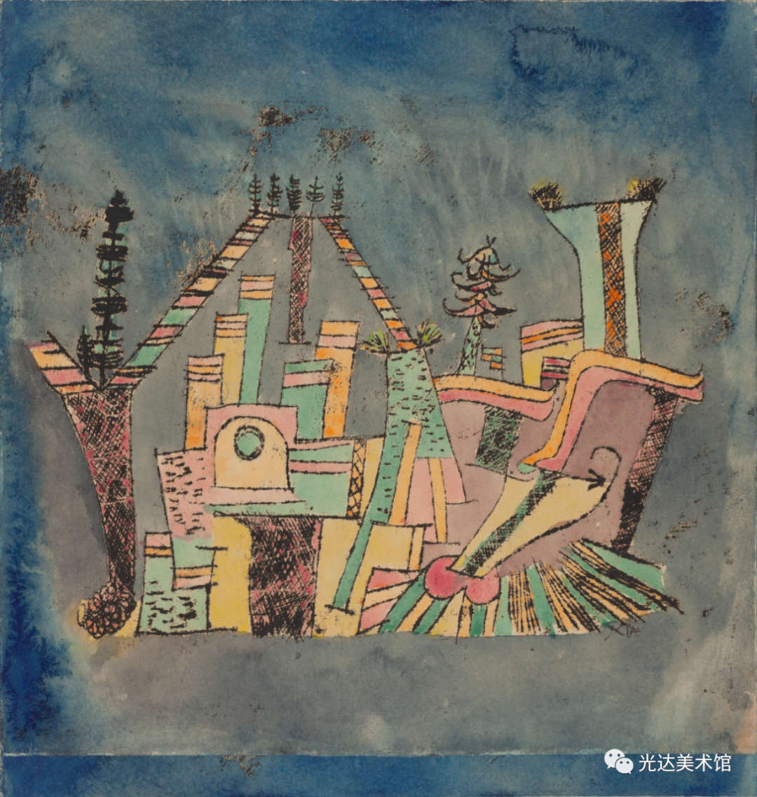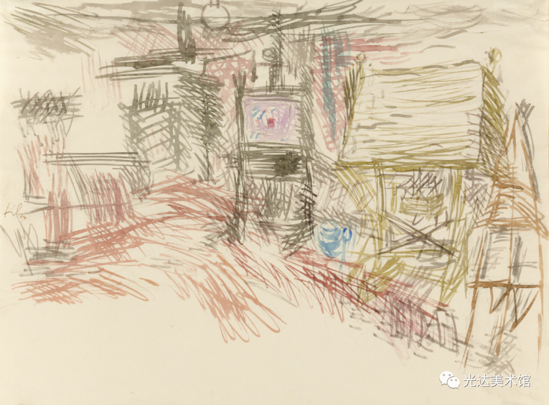 几乎从一开始,克利就承认穿越可见的表面的必要性。早在1901年,他就表达了自己的决心,要透过现象探究其背后,并给现象带来一面比仅仅反射表面的镜子更加忠实的镜子。基于此,他提到“我的镜子的忠实”[1]:这样一面镜子不仅能够照出事物表面的样子,而且能够进入内部,探测到事物的核心。因为它能同时反映出表面以下的内在的东西,因此它要比只能呈现出表面反射的普通镜子更忠实。这样的镜子已经触及难以想象的领域的边缘,因为它不仅能反映人或事物可见的外部面貌,而且能呈现出隐藏不显现的东西和那些表面之下的一些面向,而这些面向往往只在表面留下极其细微的痕迹。克利说,他的镜子捕捉这些隐晦面向的方法之一,就是在画中题写一些文字。克利确实最终挖掘出越来越多文字的启示性力量,这些文字就题写在这些意象中。 穿黄色衣服的自画像保罗·克利平版胶印39.3cm x 28.5cm1958年 克利将他自己的这面镜子与过去艺术家的镜子做了鲜明的对比。对于这些艺术家来说,对自然的研究在于“对现象极度精确的观察”。克利承认,“通过这种方式可以得到上乘的画作,但只是关于经过空气过速的事物表面的“。然而,这些艺术家忽略了克利所谓的“非视觉的印象和再现”,他们没有做到使其可见。[2]克利尽管承认艺术家对现象的观察不应该被忽视,但他还是坚持认为,在今天,这种观察应当将范围扩展到隐而不显的、非视觉的面向和维度。这些面向只有在画作中波者通过画作才能进入艺术的领城。它们必须在艺术家的镜子中被反映出来。 激情花园保罗·克利纸本蚀刻25.5cm x 32.5cm1913年 艺术“使可见”的要求可以在一幅作品里找到注脚和补充。与这个要求的关联很明显地体现在1926年以《使可见》命名的素描中。这一作品刻画了一张双眼突出的人脸,无疑恰好适合超越表面现象,使得表面下面的东西可见。克利在这幅作品中加入了文字“sichtbar machen”(使可见),用来赋予这一行为——即这个“使……可见”的行为——以可见性,而这种实践行为本身却抵抗可见性。克利还赋予画中人物的眼睛以这里的文字所表达的能力,而且眼睛的形状恰好是这里的两个题词的首个字母[3]。 使可见保罗·克利纸本铅笔11cm x 30.3cm1926年 在那些过去的艺术家中,谁的视野现在必须扩大呢?那些尽管能够通过极其准确的观察创作出优秀作品,然而却没能在作品中使非视觉的面向可见的艺术家。克利指的是谁呢?他指的仅仅是自然主义画家吗?也许是的。然而,在他1924年的耶拿演讲中有这样一段话——尽管不是毫无问题的——更具体地指出他所指的是谁:“因此,在他们那个年代,印象派,也就是我们过去的对立面,确实是依附于日常现象的萌芽和表层。”[4]印象派严格地坚守事物的表面外观,以及它们在我们的感官面前呈现出的瞬间的、稍纵即逝的、柔美的显现,他们似乎正好是克利心目中的艺术家的对立面,后者会通过艺术作品穿透表面,为的是在作品中揭开现象精美的面纱,使隐藏在表层之下的东西可见。克利的艺术与印象派所追求的绘画看起来大相径庭。 火车站保罗·克利铜版画25cm x 37.4cm1911年 克利在耶拿的演讲不禁让人觉得他与印象派完全对立,然而事实上,克利与印象派之间的关系远比人们猜想的要紧密。克利在1905年的第一次巴黎之行中看到印象派绘画,这一经历的意义不是简单地使他站在了他所看到的事物的对立面。实际上,克利从不会指摘对现象的准确观察。1903年的一篇日记强调了很重要的一点,克利在他的包豪斯讲座中经常在不同的语境中反复提及。克利在日记中解释道,我们一开始会被自然所迷惑,这是因为“我们先看到的是外围的细枝末节,没有能长驱直入直接洞察主干或躯干”,然而一旦进步观察,我们就会意识到,“即使是在最外围的一片树叶中,我们也能看出对整体法则的重复,并对其充分利用”。[5]克利创造性的作品能充分证明,他坚持进行着这种观察。比如,他曾说过:“1907年夏天,我完全投入自然现象中,并在这些研究的基础上构建了玻璃上的黑白风景画,1907—1908年。”[6]克利所要强调的重点是,这种准确观察是不够的。艺术家必须同时从远处与自然发生关联,必须与自然进行高效的对话,必须转换自然进而揭露潜伏在自然内部、在其可见的表面之外的面向和维度。 画家的工作室保罗·克利纸本水彩32.2cm x 43cm1933-1940年 克利当然会承认,莫奈的目的不是简单地采用自然主义手法,去描绘我们直接能看到的事物。即使莫奈宣称自己的意图是直接表达在自然面前的印象,但他的这种表达将关注点从显现的事物即现象转移到了显现本身。为了表达这种显现本身,就有必要去描绘光线在周围环绕的气氛中的流散,以及弥漫的光打在地面和事物上产生的反射和倒影。光线的弥散和反射使事物变得可见,然而按照平常的视觉习惯,其自身却是难被看见的。尽管它们能够赋予事物可见性,其自身却徘徊在可见的边缘,因而在绘画中或通过绘画才可见。在某些画作(就像前面提到的《麦垛》)当中,莫奈通过画出元素性的显现而非显现的事物使光线可见:莫奈颠倒了日常的视觉,使显现本身可见的同时把显现的物体边缘化了。即使他的目的是捕捉瞬间发生的事件——比如,窗外经过的行人向窗内扫了一眼——,一幅画也可以使一些瞬间性的、通常没有被注意到的
