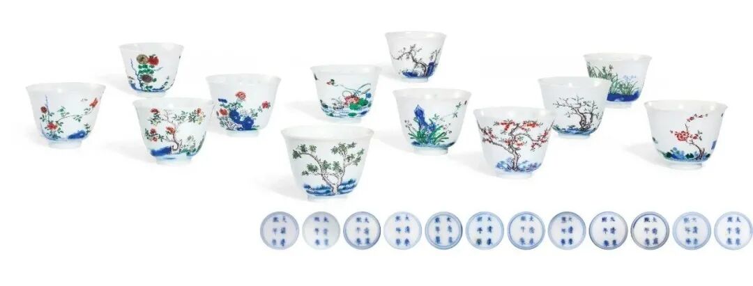 十二月令花神杯为康熙官窑之旷世奇珍,依月令之数为一套,有青花和五彩两类。