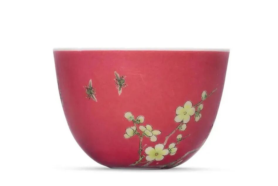 清雍正 珐琅彩胭脂红地梅竹纹酒圆