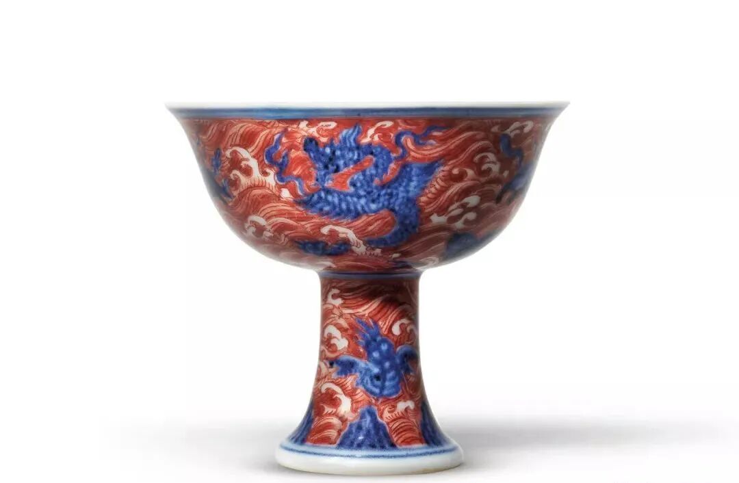 杯形端庄,小器大样。青花异形的海兽与红彩密布的乱涛形成强烈的视觉冲击效果。