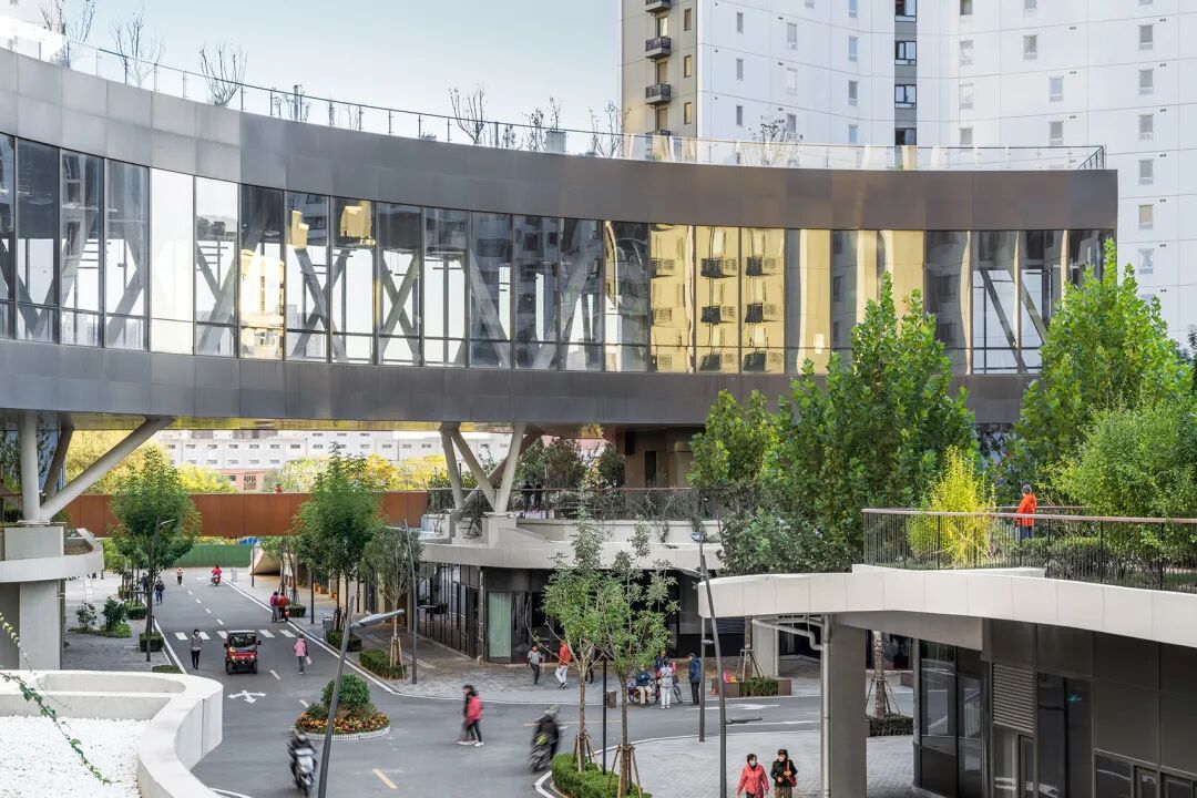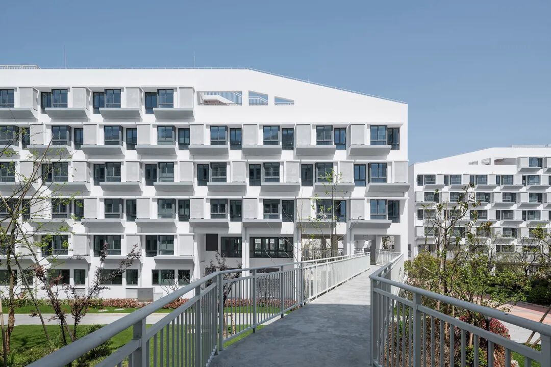 图1-2 水围柠盟人才公寓连廊。通过连廊将所有楼栋、屋顶花园、电梯庭院和青年之家打通,形成四通八达的网络,同时也成为居民休憩、交流的公共空间,并营造出立体的生活街区 © DOFFICE