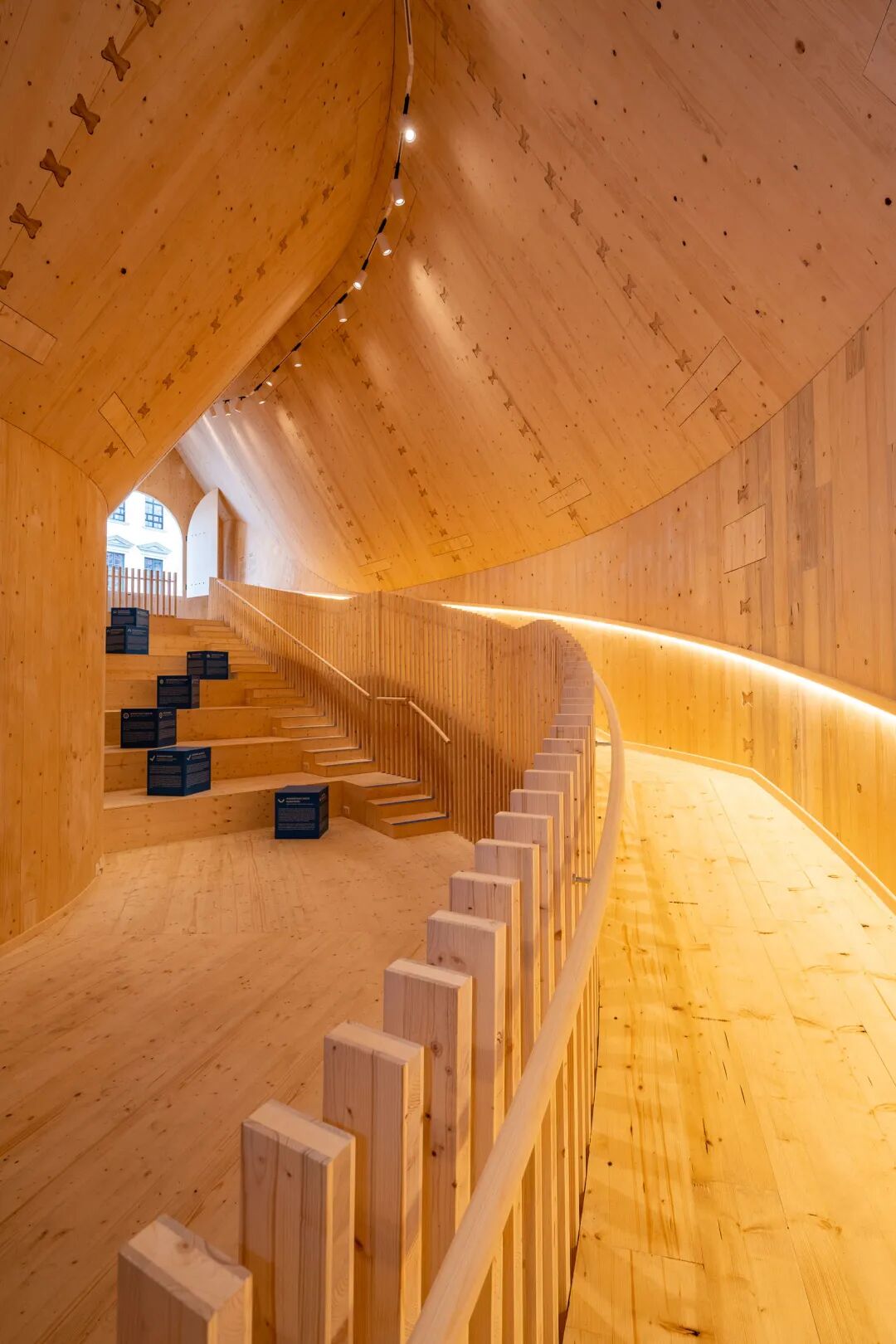 在展馆用材上,MVRDV遵循绿色化可持续原则。展馆结构完全以交叉层压木材建造,取材于富格社区自己的森林,并由当地木匠完成木制内饰的制作。这种木材可以很好地储存碳,而非将其释放到大气中,加重环境负担。