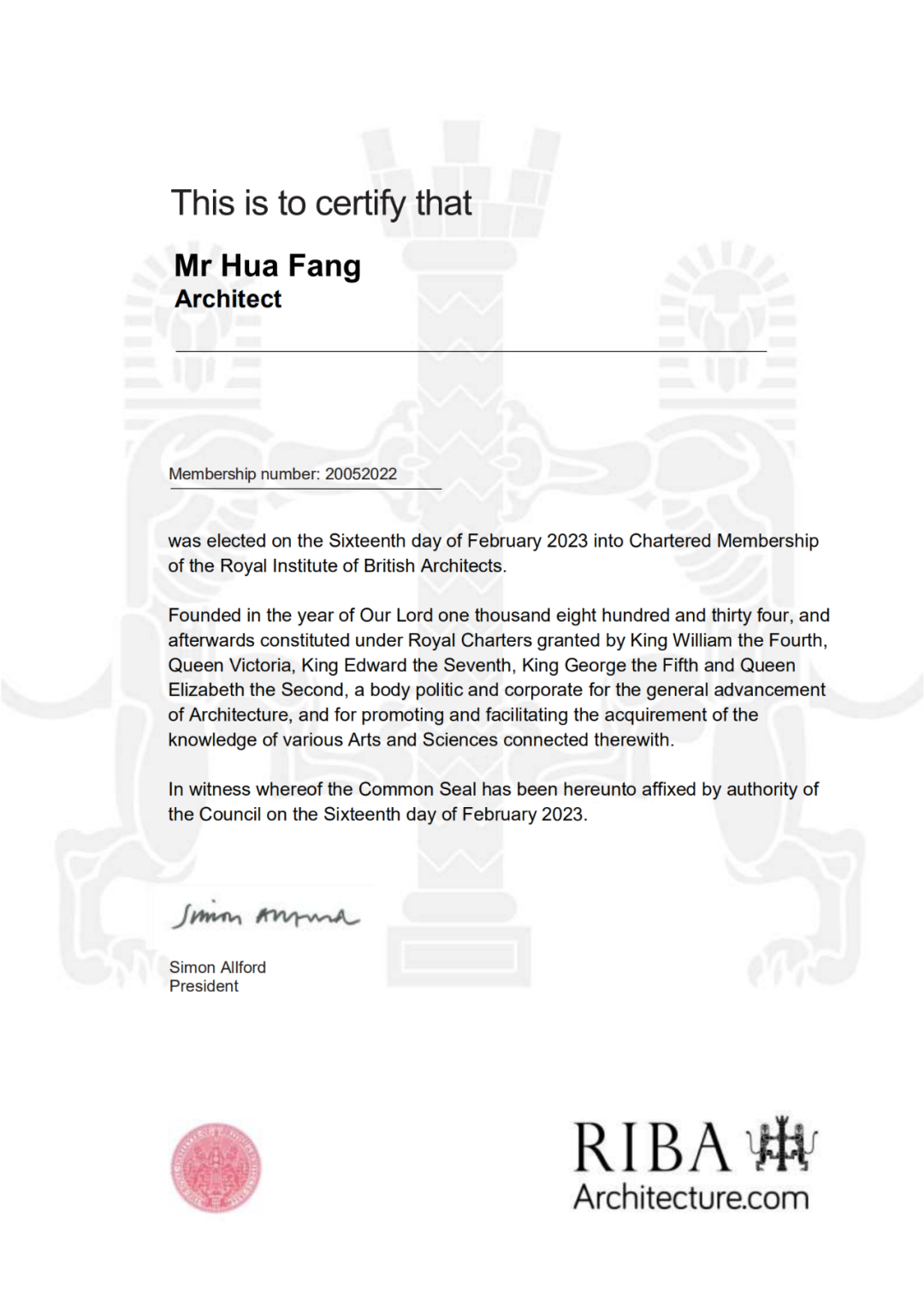 近日,锋思城界建筑设计研究院有限公司创始合伙人、首席建筑师方华受邀,正式成为英国皇家建筑师学会特许注册建筑师(RIBA Chartered Member)。