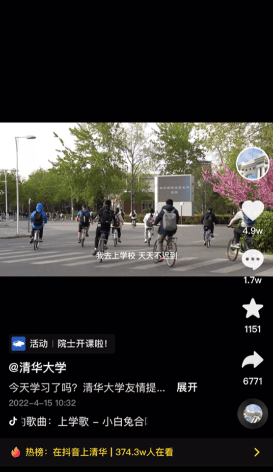 根据抖音2021年的数据报告显示,截至2021年底,已有包括清华、北大、复旦、上海交大在内92%的全国“双一流”高校入驻抖音,全年高校开播场次达14463场。而清华大学作为直播观看人数最多的高校,吸引了近千万的“抖音旁听生”。