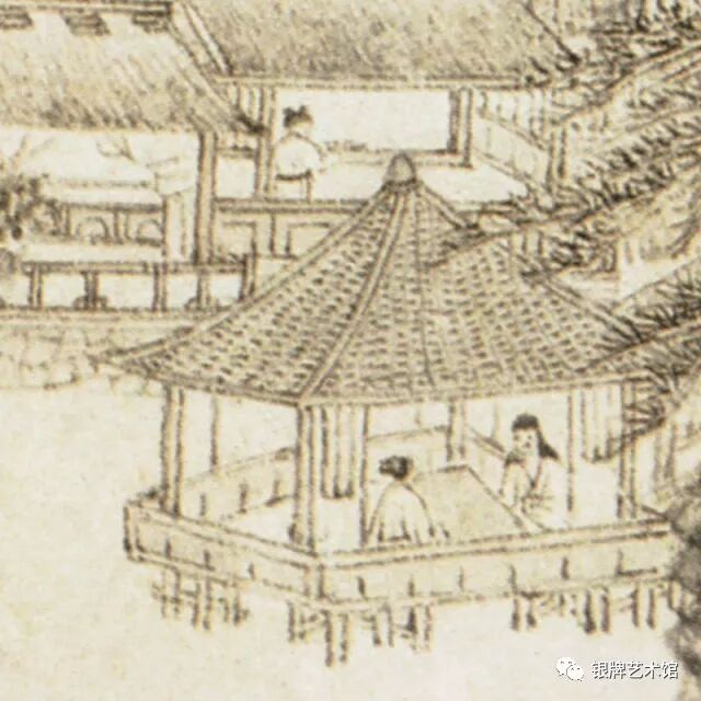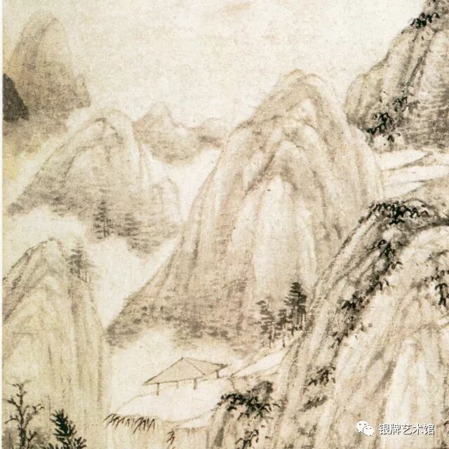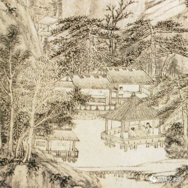 此画笔墨秀润素雅,山石作披麻皴,皴擦并用,树木枝叶钩点结合,亭台、茅舍用线横直、长短富于变化。