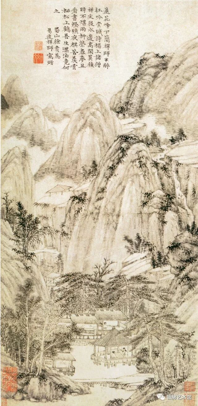 画上题识表明这是“蜀山徐贲为易道禅师写赠”,并题有七言古诗一首:“莲花峰下简禅师,半醉狂吟索赋诗。