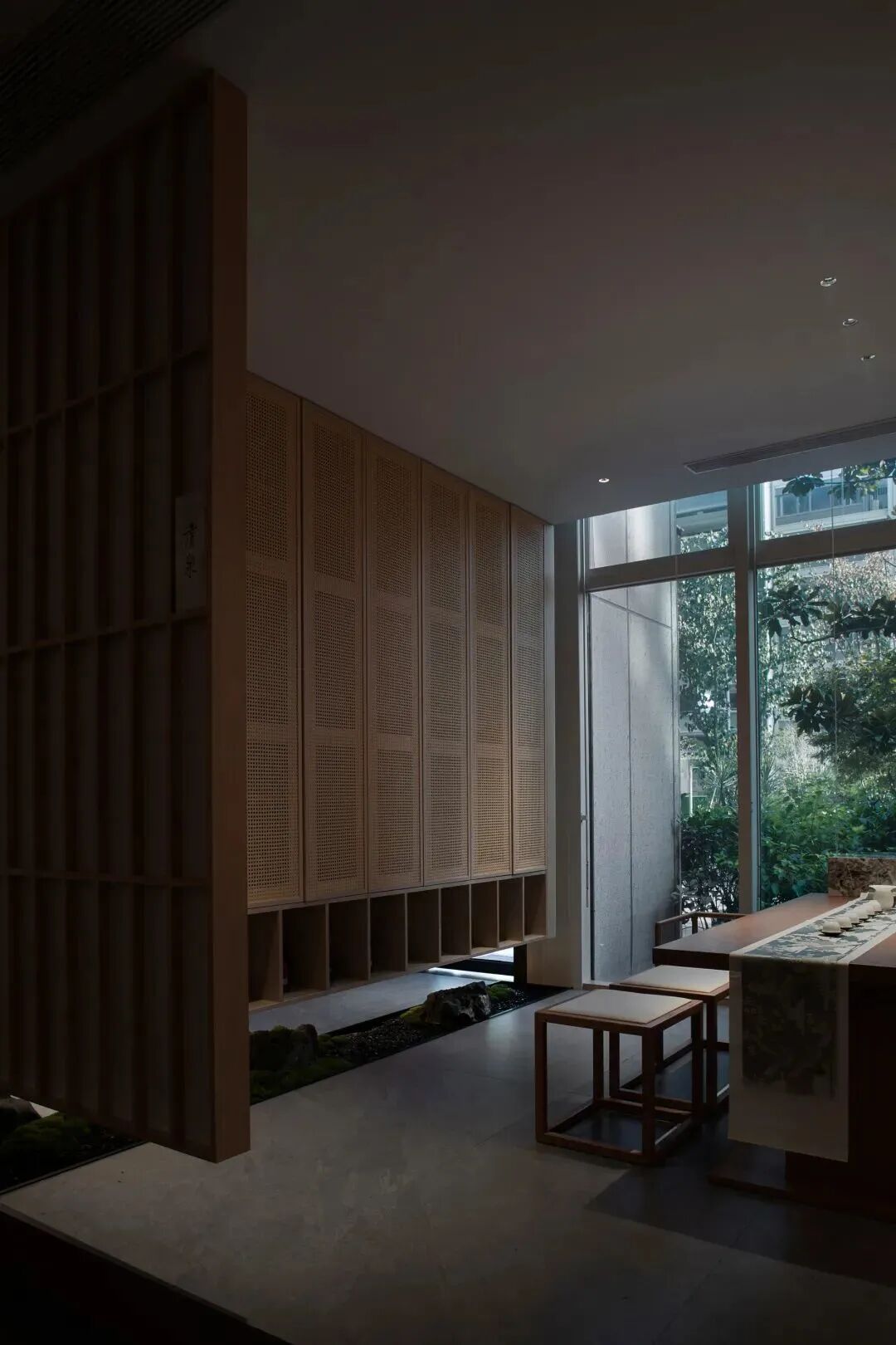 抬高的茶室,令人与自然的距离变得更近。作为茶的载体,水用它的无形包容茶的甘洌。当我们在回味一杯清茶带来的愉悦时,其中也包含了环境带来的意味,随着光影变化,也体验了另一个不同的空间维度。
