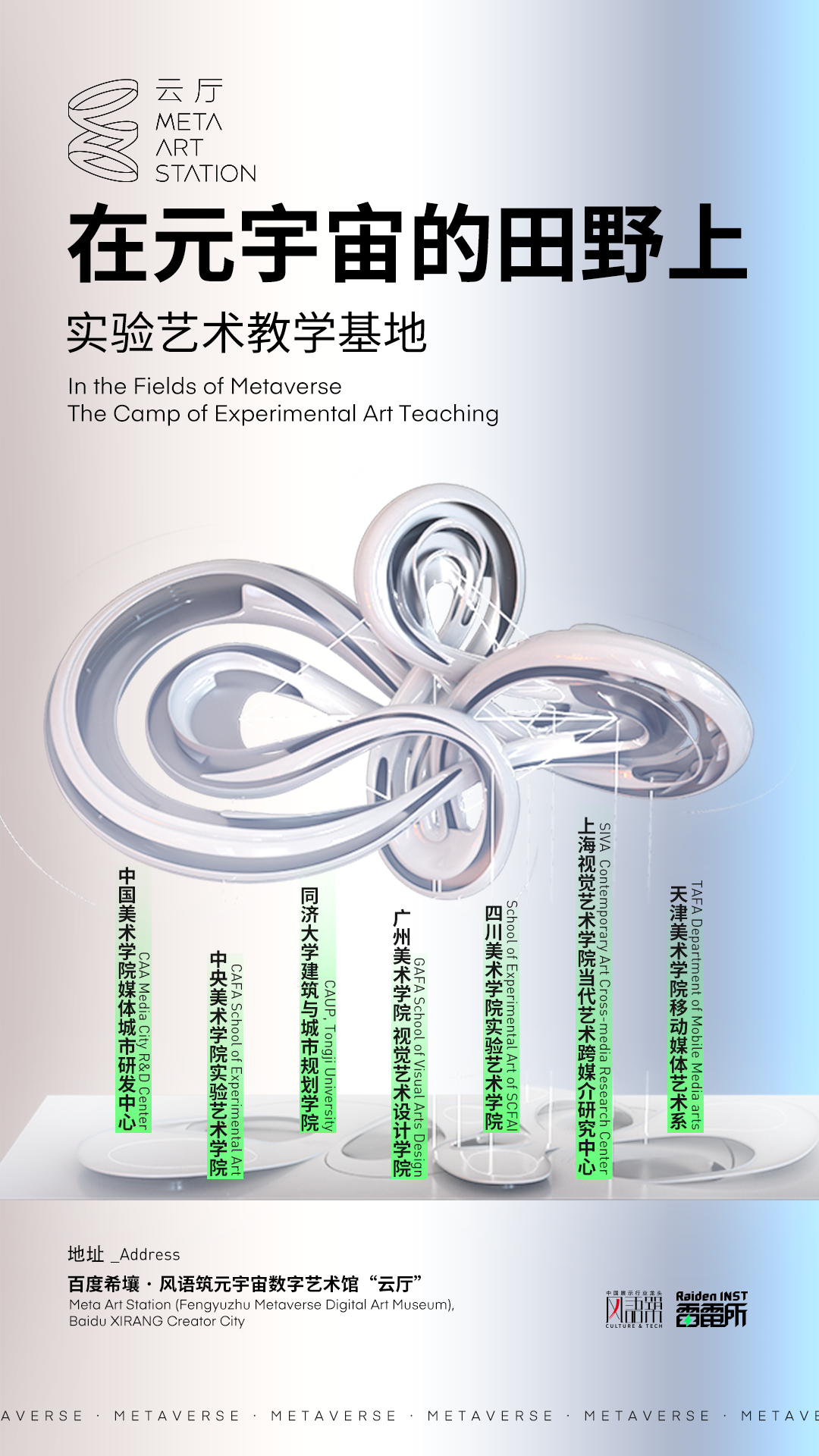 此外,云厅还联合了中国美术学院媒体城市研发中心、中央美术学院实验艺术学院、同济大学建筑与城市规划学院、广州美术学院视觉艺术设计学院、四川美术学院实验艺术学院、上海视觉艺术学院当代艺术跨媒介研究中心以及天津美术学院移动媒体艺术系等各⼤院校,成立“在元宇宙的⽥野上——实验艺术教学基地”。