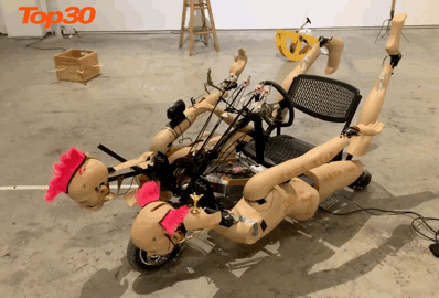 Top30:假人,我觉得是非常好的一个创作的材料和一个媒介。他有符号的特质,有社会符号性。因为每个人都像是一模一样的一个模子,被加工出来,某种程度上很像现在的这种教育。假人就好像齿轮一样转动的,在社会上按部就班地工作、生活的每个人。没有感情,没有灵魂做着一样的重复的事情,这个符号性特别强烈。
