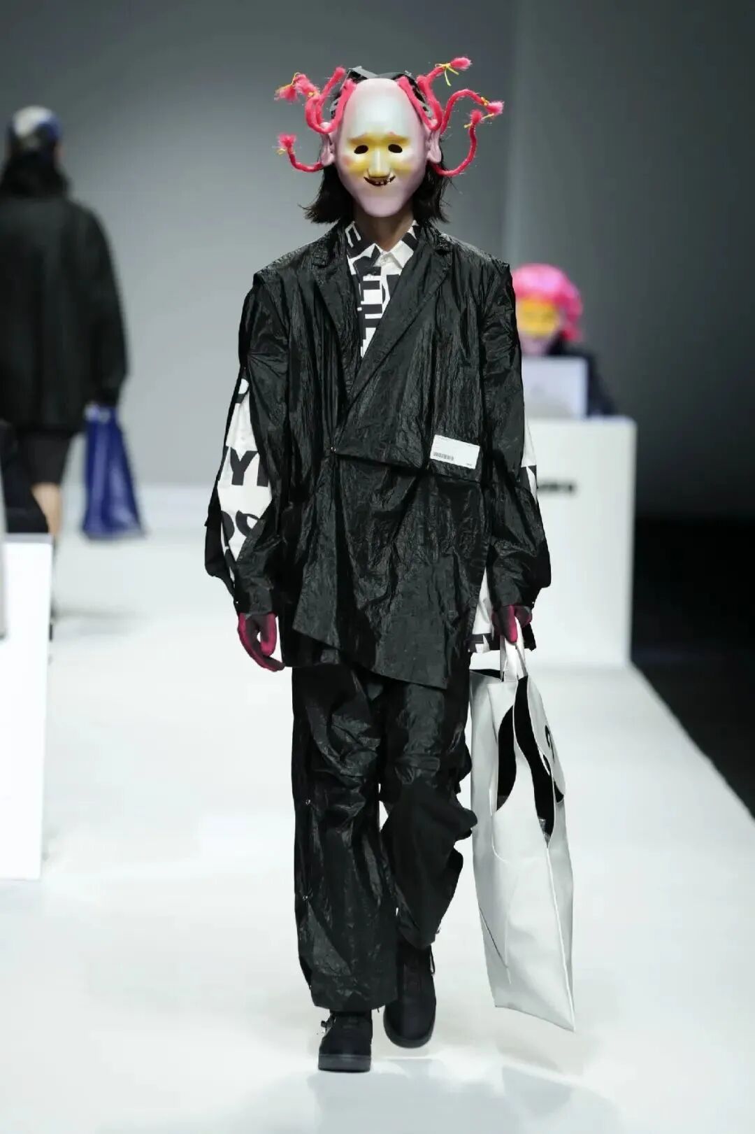 Top30与NIKE合作联名款鞋子,与FMACM合作研究可穿戴潮流装置的应用。可穿戴潮流装置对走秀模特进行emoji表情化处理,展示线上时代的角色表现。积极探索人与人、人与全新的信息社会的关系、当下青年的独立视角,把对当下生活的观察思考和对未来社会的无限探索,融入到创作中,并结合图形形式感、 艺术装置创作、鞋品设计和音乐创作,展现以「景观社会」为主题图景的时装发布秀。
