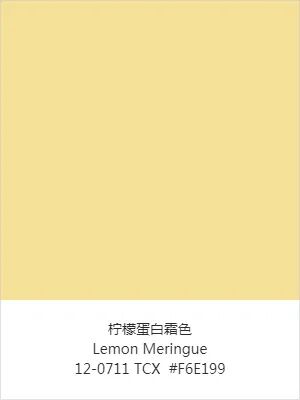 柠檬蛋白 (12-0711 TCX) 具有超高的亮度,它显得更加强势,温暖感被阳光的炽热所覆盖,耀眼的黄色同样带来极端的视觉感受,它展现出绝对的自信与活力。
