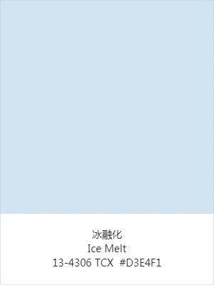 冰融蓝 (13-4306 TCX) 在第一眼就使人置身于远古冰川,见证开阔的蓝色是如何演变,而它又是如此的温柔与包容,冰融蓝能够赋予穿着者一种理智淡雅的气质。
