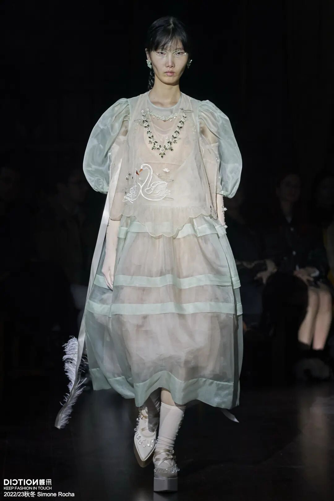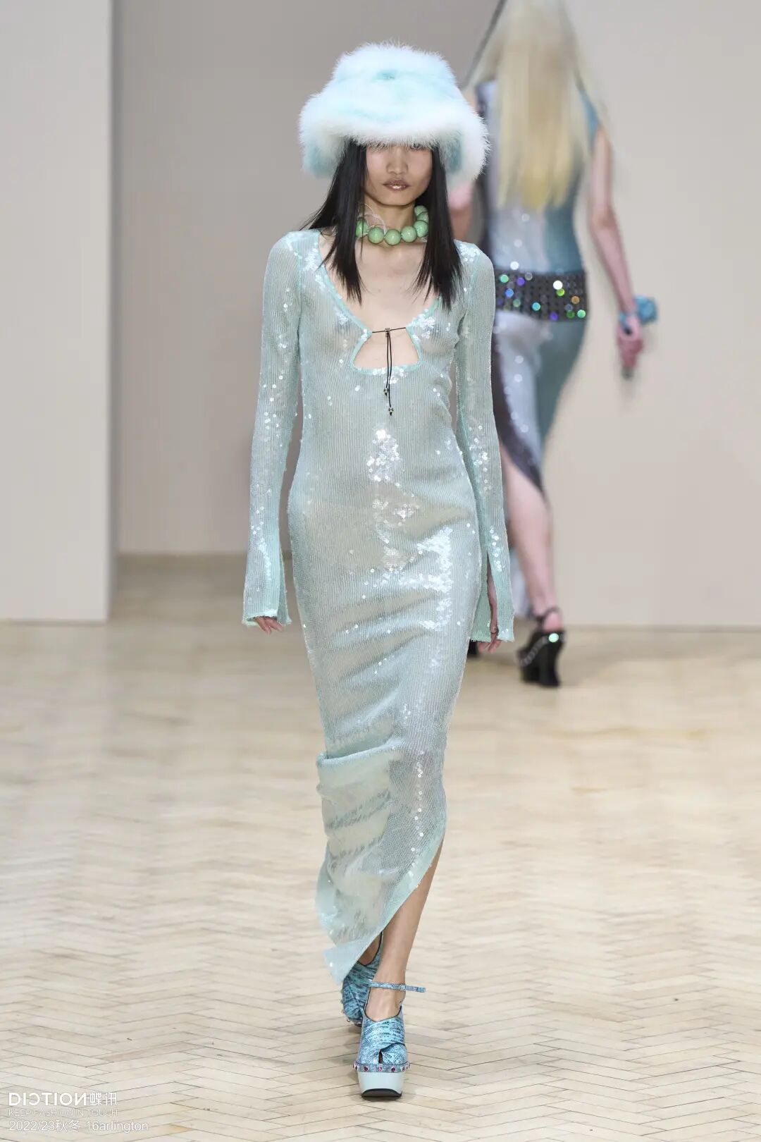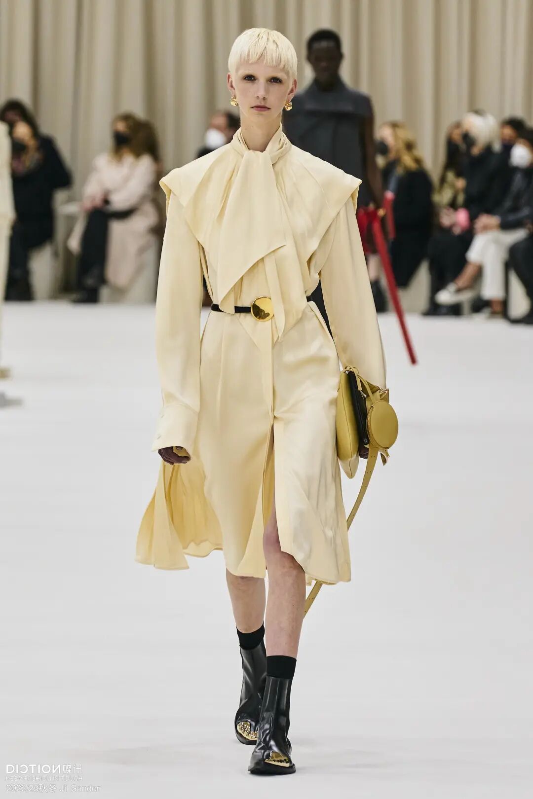 粉蓝色 (12-4607 TCX) 在本季秀场中得到多种演绎,在年轻化设计中占比更大,其灰调相对较重,甜美感被大大减少了,更加强调其清爽的特质,因此适合打造新式少女装束,盐系穿搭可作为主要系列推出。