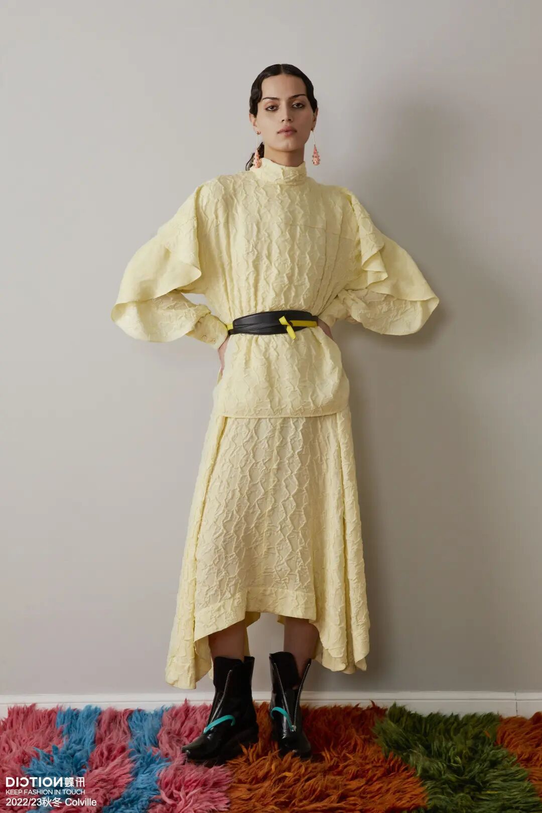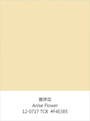 茴芹花色 (12-0717 TCX) 是暖调的淡黄色,它色彩淡雅适合打造具有包裹性温暖感的冬日单品,轻柔的纯度配合纯粹的色相,这种颜色对于肤色有一定要求,亚洲市场中可以加入其他色彩的单品进行叠搭造型。