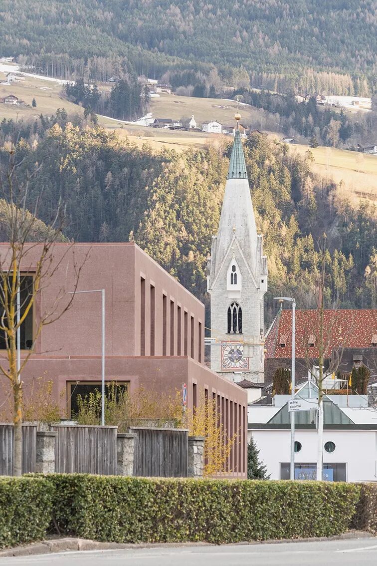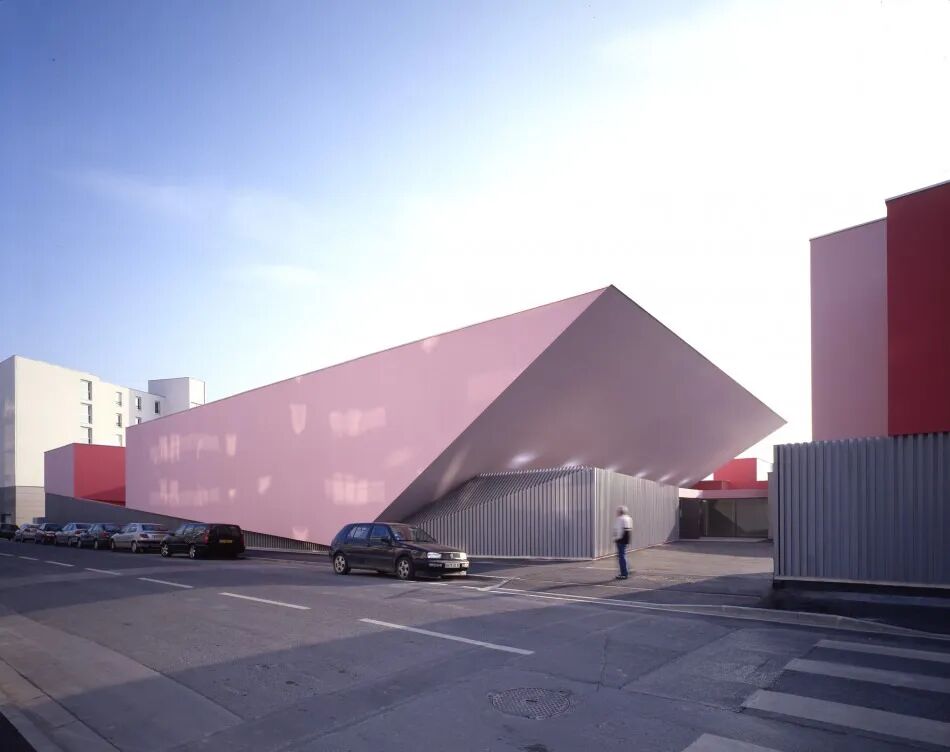 这座“L”型建筑毗邻商业街,向南向的游乐场开放。一个大的对角悬臂宣布了主要入口,并产生了对购物中心的空间呼唤。