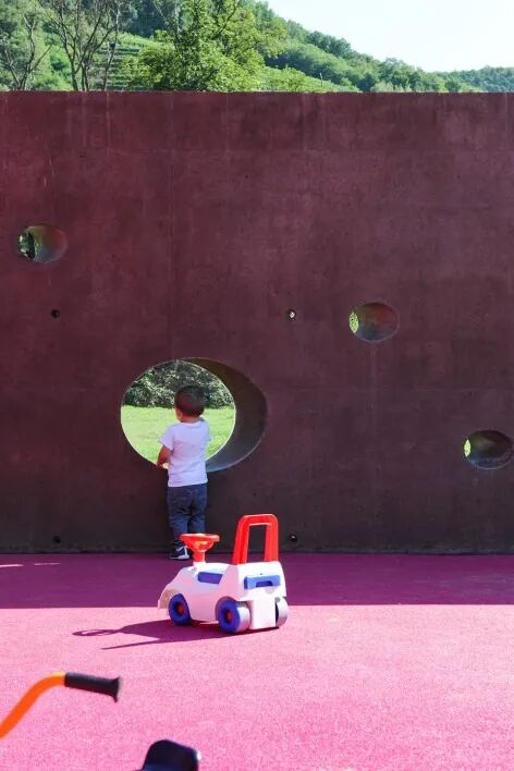 颜色、材质各不相同的体块扭转交错,如积木般堆叠在一起,部分体量悬挑于活动场地之上,为孩子们遮挡风雨和阳光。