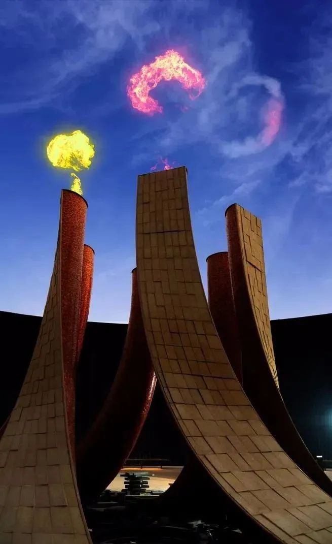 水墙以三个入口切入这座火山般的结构,形成了入口和三个观景台,游客至此可以俯瞰竞技场和壮丽的景色;而夜间还有火焰与灯光的别样演绎。