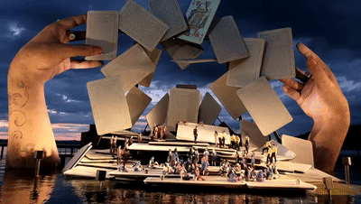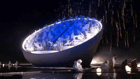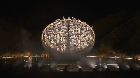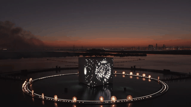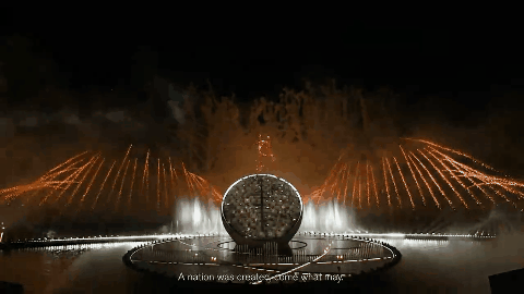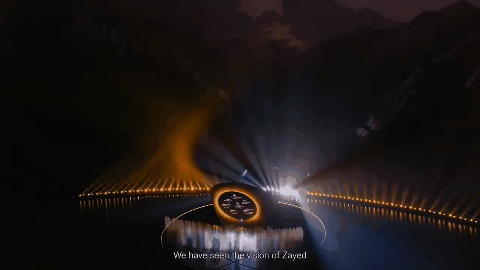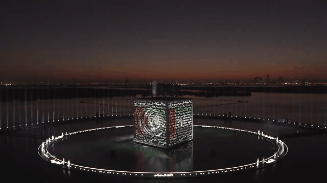 整个演出以水中央一个15米高的旋转立方体雕塑为中心,扮演了叙述者的角色,随着四周被投影的视觉照亮,描绘出受阿联酋历史和价值观所启发的主题。就像是在海中央徐徐展开的画卷。