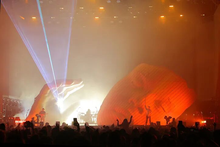 Devlin 对The Weeknd的脸进行3D扫描,为其打造了一个9m高的面部雕塑。巨大的“人像”让舞台呈现出别有的一番视觉效果,随着演出的进行,通过数字投影与灯光,面具的色彩会不断变化,时而像石膏、时而又像金属,燃爆全场。