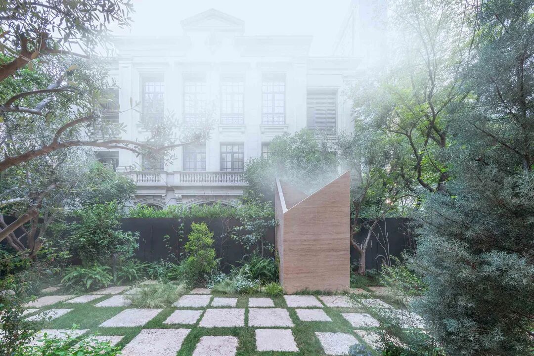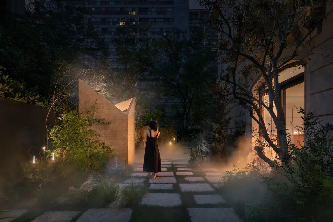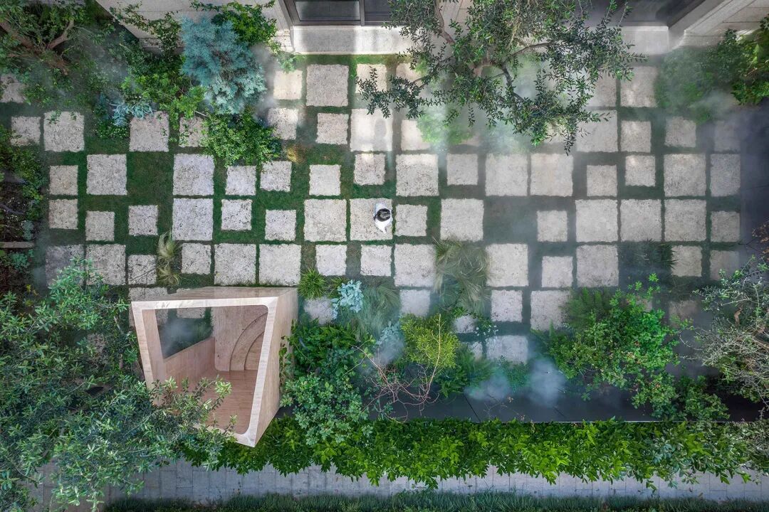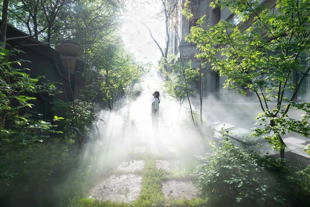 此外,水雾冥想中心表面材料与地面石板皆取自于合肥当地洞石,数百块石材由当地工匠手工敲打出不规则的边缘,有如被水雾侵蚀所形成的自然现象;而可提供大量水雾浇灌系统的水雾冥想中心,不仅替环境带来凉爽的微生态系统,其隐蔽的形体让居民在早晨、下午、夜晚有着戏剧般的非日常性体验。