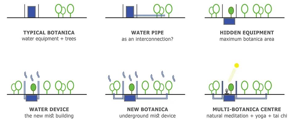 HAS design and research对于此项目进行深入研究,发现传统植物园有著巨大的水箱设备,虽可用为植物园的浇灌系统,但空间上却区隔为植物与设备两种体系