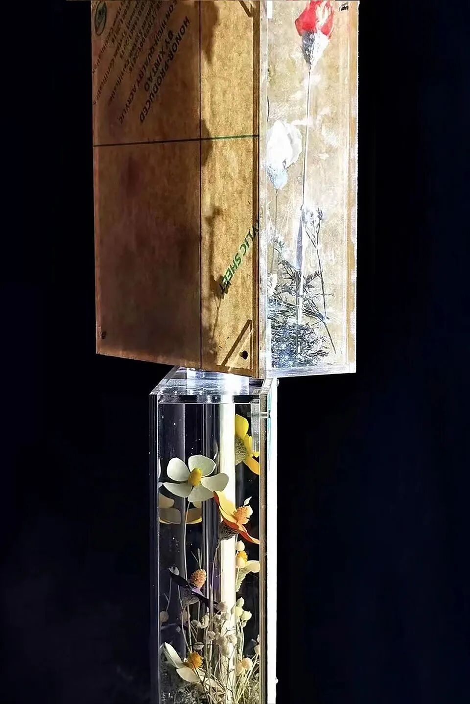 装置的单体为4种不同尺寸的亚克力盒子,根据高度和主题进行组合,由金属管串联,每个单体装置都能转动。通过高度的增减和装置组合的变化,设置冰之花-花之声-花之书-种子格四个部分。