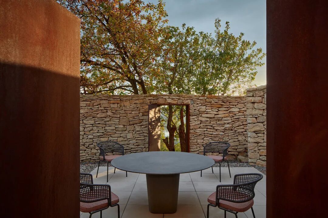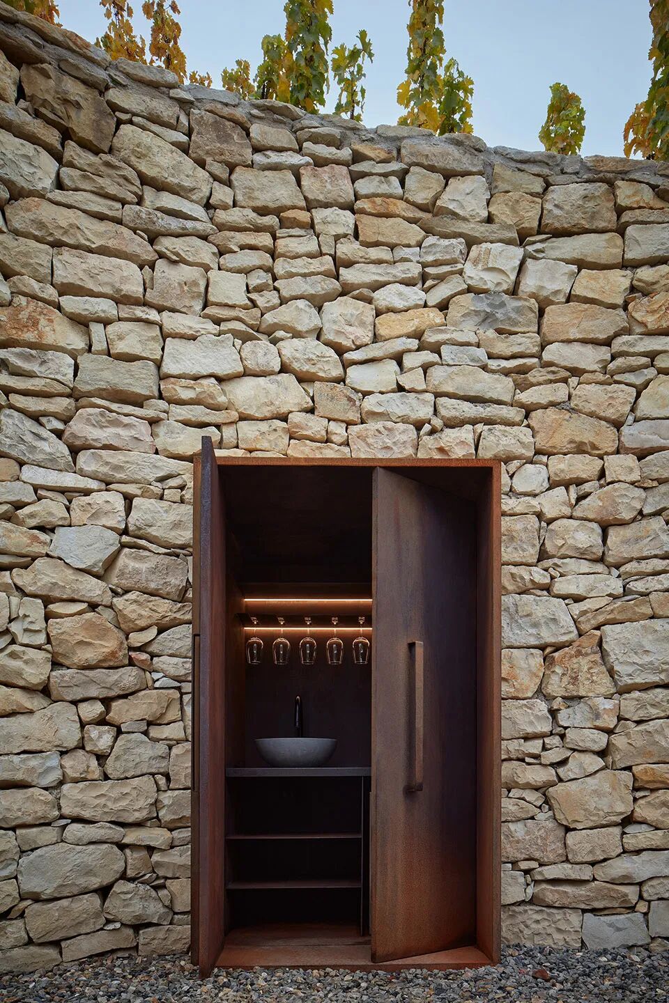 项目的设计是通过探索和保护场地现有元素来实现的。将其中的一个元素——一个带门的老橡树作为主要的象征形象,当门被关闭时,人们的注意力会不受城市景观干扰地集中在葡萄种植园上。另一方面,当打开这扇窗,也能够建立起与城市之间的联系,并引导葡萄种植园未来的扩张。通过场地轴线的镜像特点,设计师建造了另一扇耐候钢材质的门,这扇门通往的壁龛被用作一个储存和供应葡萄酒的小酒窖。