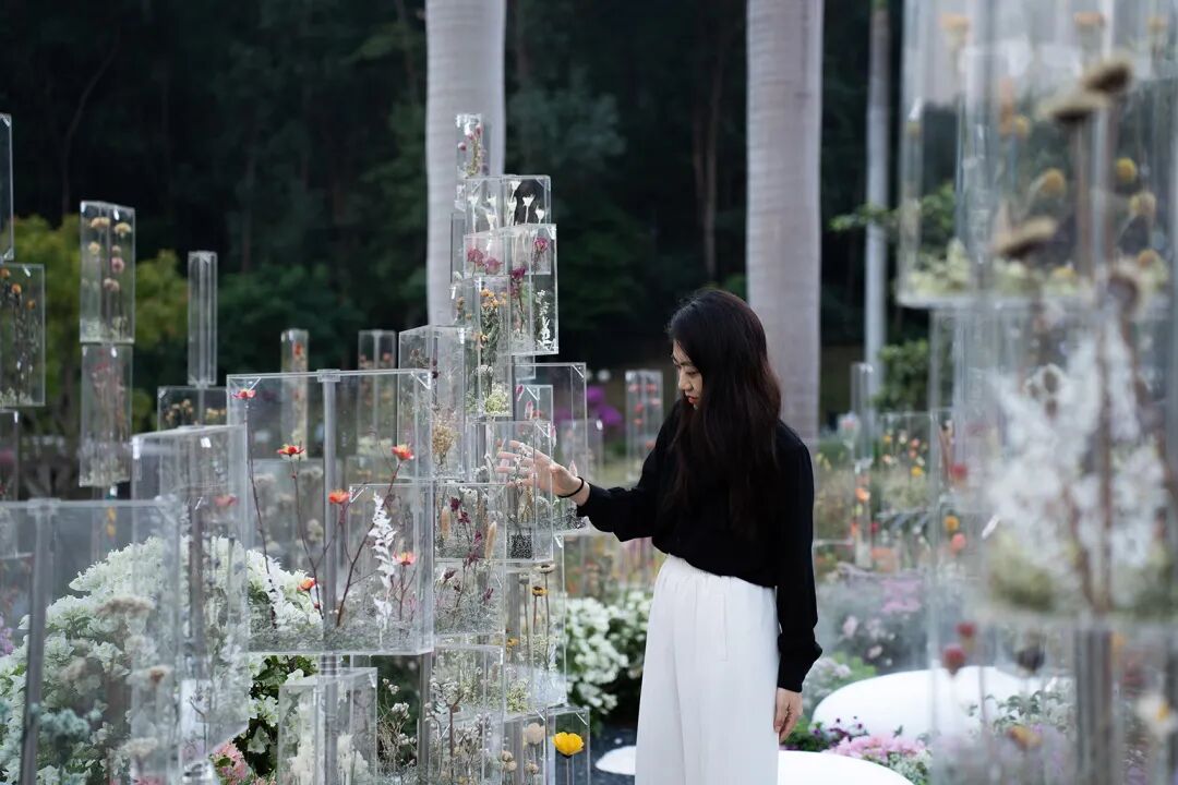 在冬短夏长、气候湿热的深圳,设计师希望花园可以营造炎炎夏日里的清凉气息,治愈疲劳,邂逅永恒。冰,虽晶莹剔透但单调无彩;花,虽争奇斗艳但稍纵即逝。因此,我们的设计以“冰封花朵,邂逅永恒”为主题展开,将选择的不同种类干花置于高低错落的亚克力盒体中,象征冰冻的花朵,以期打造一个沁人心脾、自在舒心的空间,在仿佛被冻住的时间和空间里欣赏花朵暂停的姿态和永恒的美。