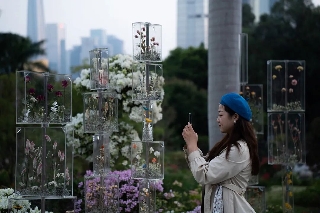 138个“冰封”花格,耗时5天完成。在每一个花格右下角,贴了相应的花百科二维码。当游客转动花格,仿佛在翻阅一本花的3D百科全书。此起彼伏的装置形成“花浪”,串联花格的风铃发出清脆悦耳的声音,“阅读”的美妙韵律感萦绕心头。
