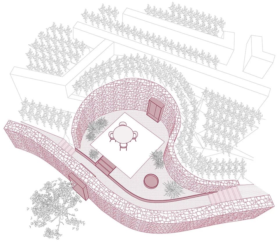 人们在葡萄种植园中发现了一个被遗忘的,有着弯曲空间的石头废墟。由于废墟与周围的景观巧妙地融合在了一起,这里成为了设计的出发点。设计师建议采用与废墟现状形态一致的斐波那契螺旋结构,通过加固螺旋状的墙壁,一个独特且安静的绿洲模样被呈现出来,该结构也解决噪音污染的问题。这个简单且与城市隔绝的空间创造出的氛围,将使用者的注意力重新吸引到城堡与葡萄种植园的方向上来。