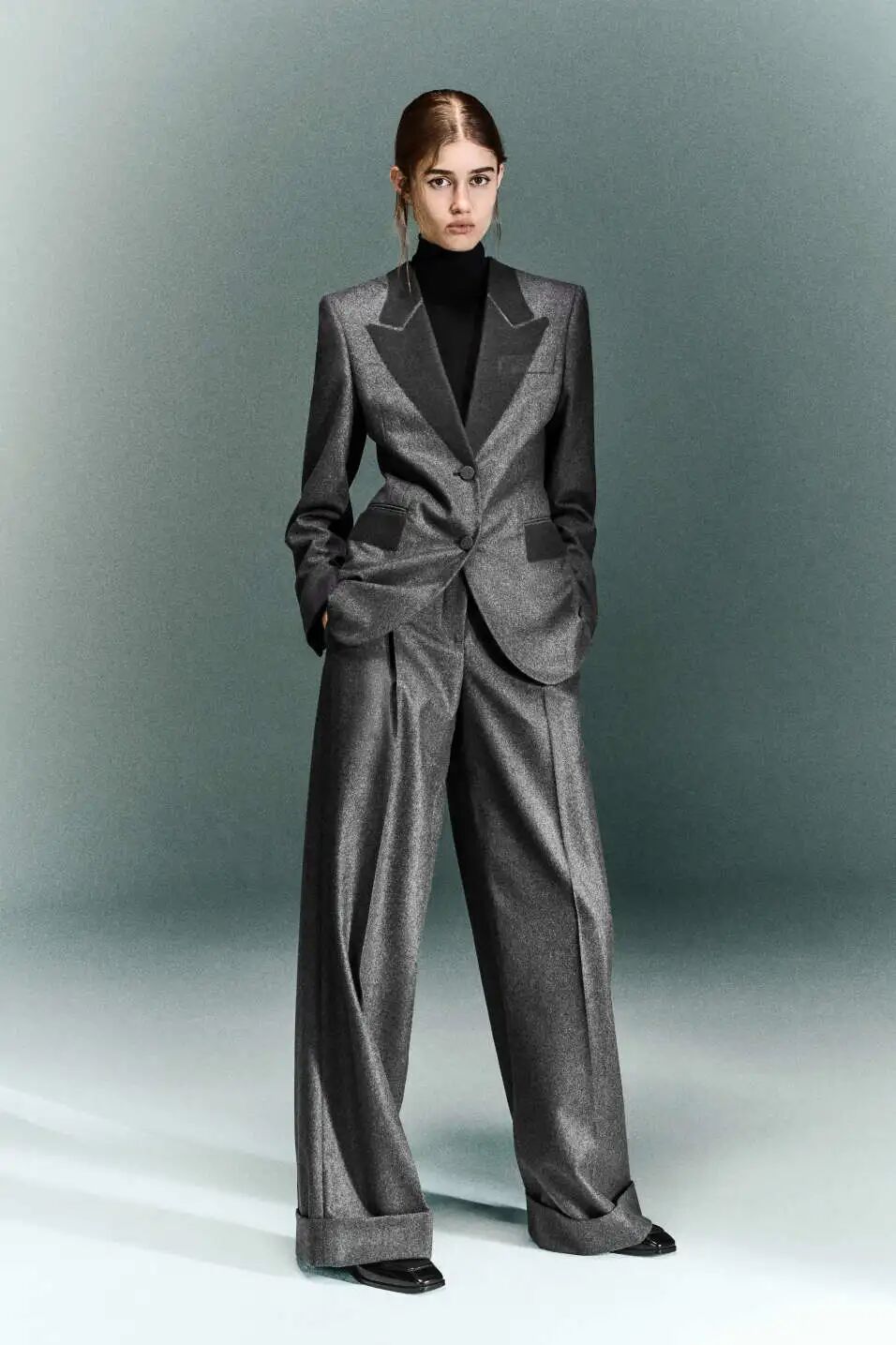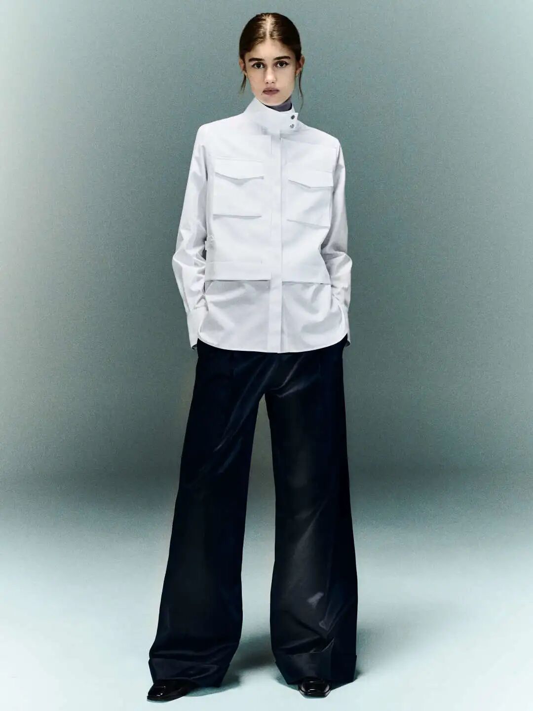 有型的阔腿、翻边的西裤,让冬日的庄重不再无趣。这时说“搭配哑光或光泽面料的上装”只是很空洞的官腔,大白话是:面料都很奢侈,如羊毛和马海毛的混纺、羊毛羊绒和法兰绒的混纺、纯棉和嘎巴甸的混纺……是的,就是Burberry风衣的那个嘎巴甸。也就是说,即使是一件白衬衫,也考虑到了冬日的防风。