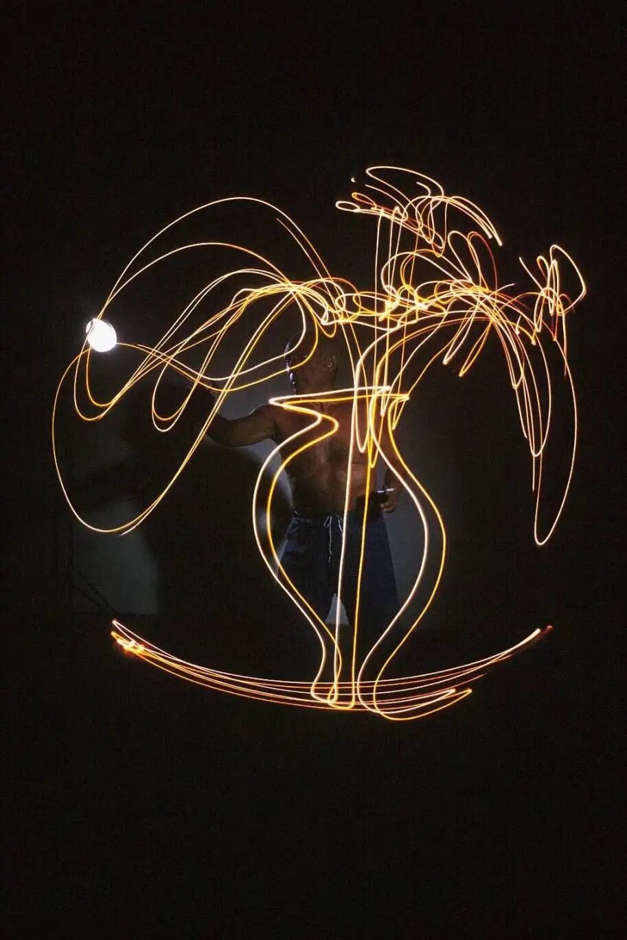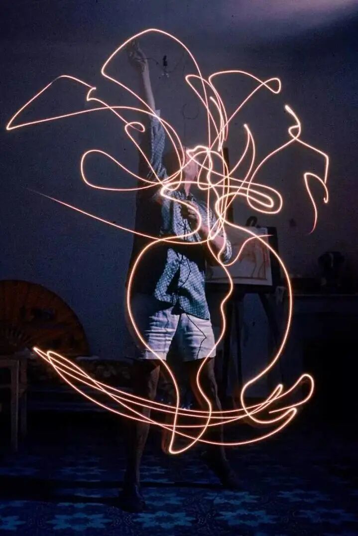 这不是电脑合成,而是已经被现代摄影加特效遗忘已久的“光绘”(Light painting)技术。如其名,光绘指合理掌控光线、运动和时间,用慢速曝光法创作出如幻似梦的视觉。毕加索就一度很爱光绘,他的创作也成为这次ANEST COLLECTIVE 2021秋冬大片灵感的直接来源。