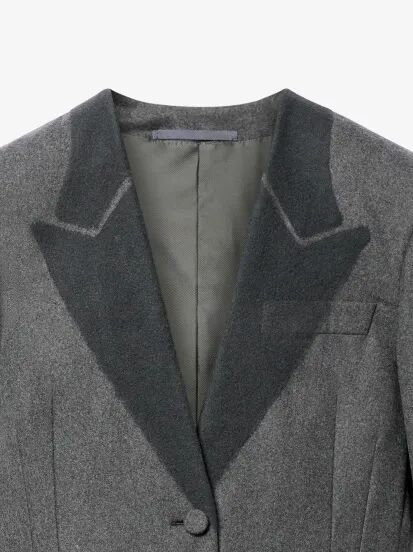 尤其是这件灰泥色羊毛羊绒混纺西装的翻领,其实是针刺阴影,也就是说它们并不是能真正翻立起来的两片领子。这种“视觉陷阱”效果不是通过印染,而是用了极其考验工艺的刺绣。