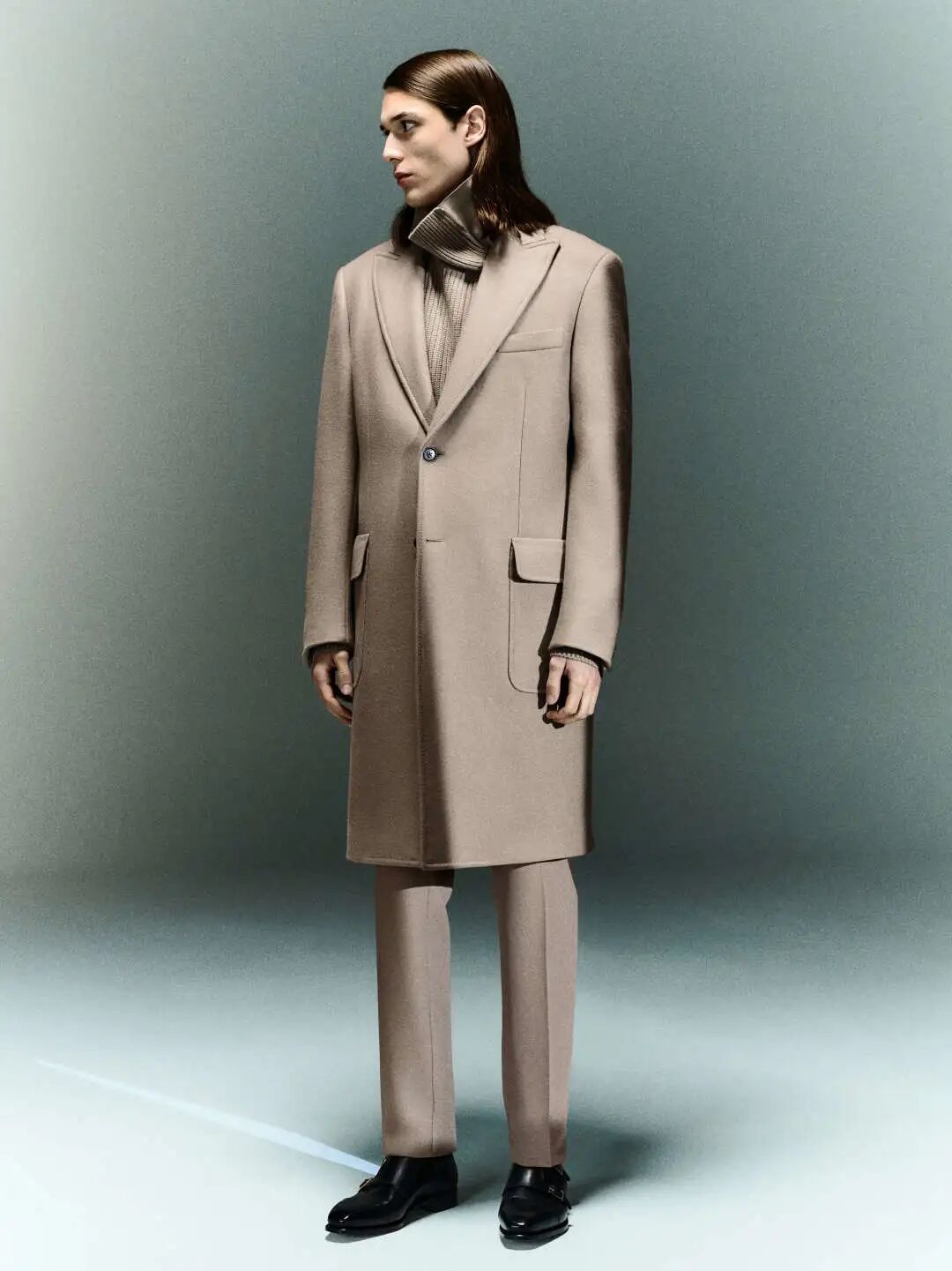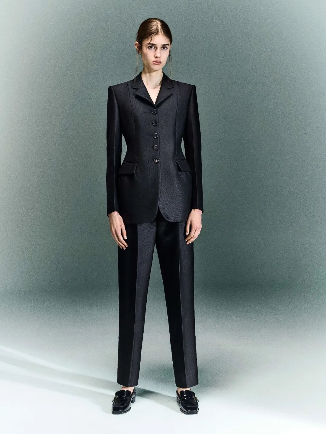 女装里还有两个细节,一个是沙漏形腰线,中和了垫肩的凌厉,以柔克刚;另一个是西装和大衣上的手工扣眼,这是取自英国18世纪男装的元素,并在纽扣上增加了品牌Logo细节。