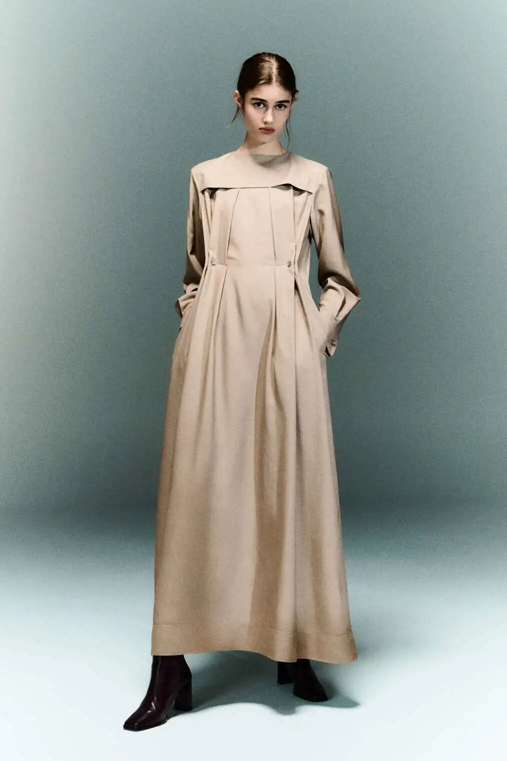 比如大片里的这条象牙色斗篷连衣裙,有一对颇像和服的袖子;上半身有点儿运动风,但腰线和及脚踝的裙长拉长了下半身视觉效果。最妙的是倘若它完全舒展开开,会刚刚好在《Uomo Vitruviano》的那个圆形之内。