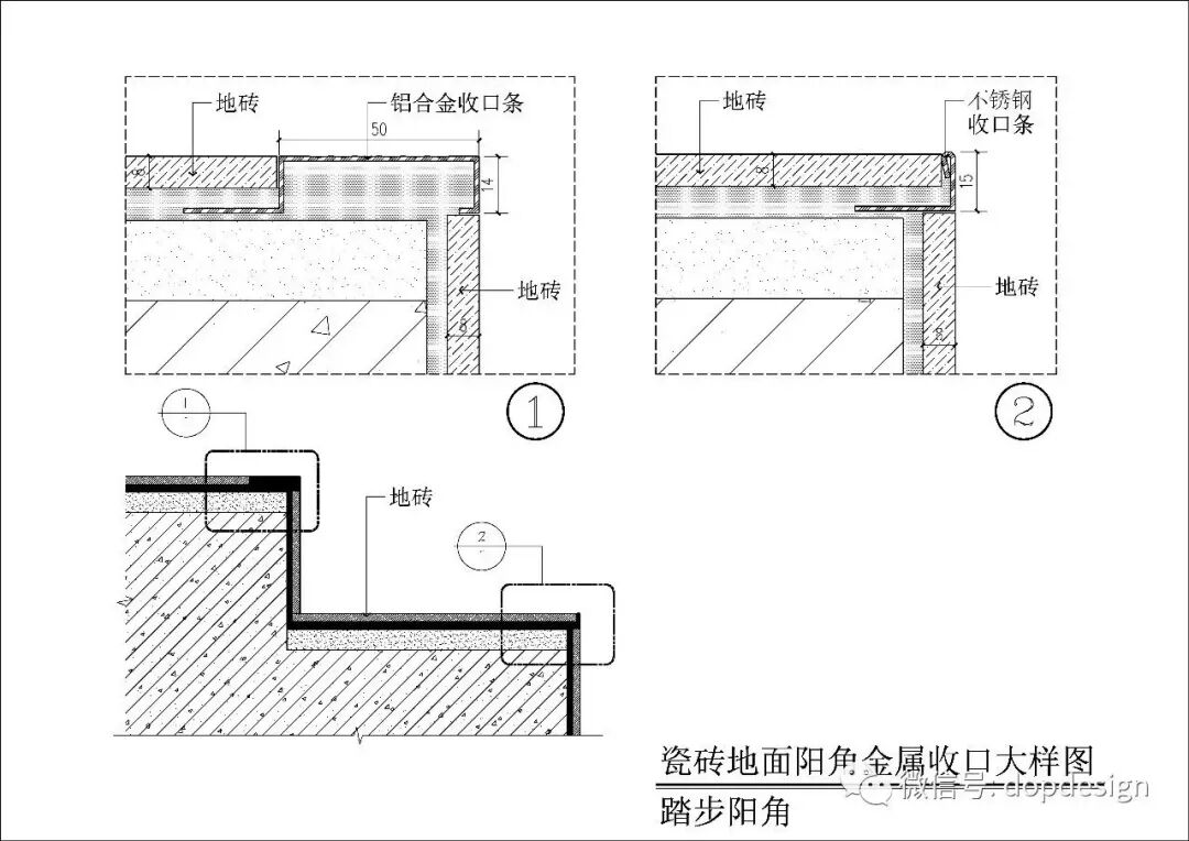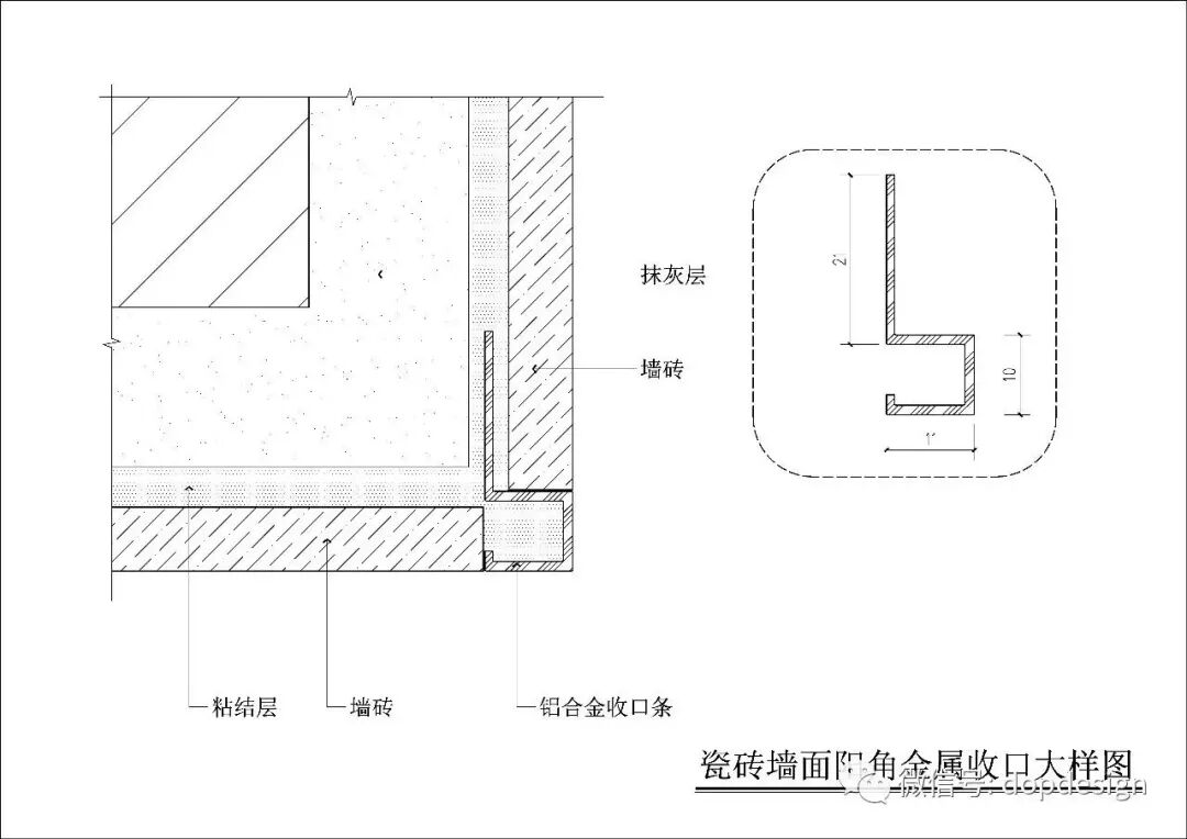 上图中第二个节点的收口做法,金属条可以为不锈钢板折边加工,这种样式同样可以使用在墙体阳角的收口。