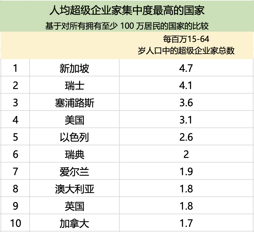 超级企业家最多的前10名国家中