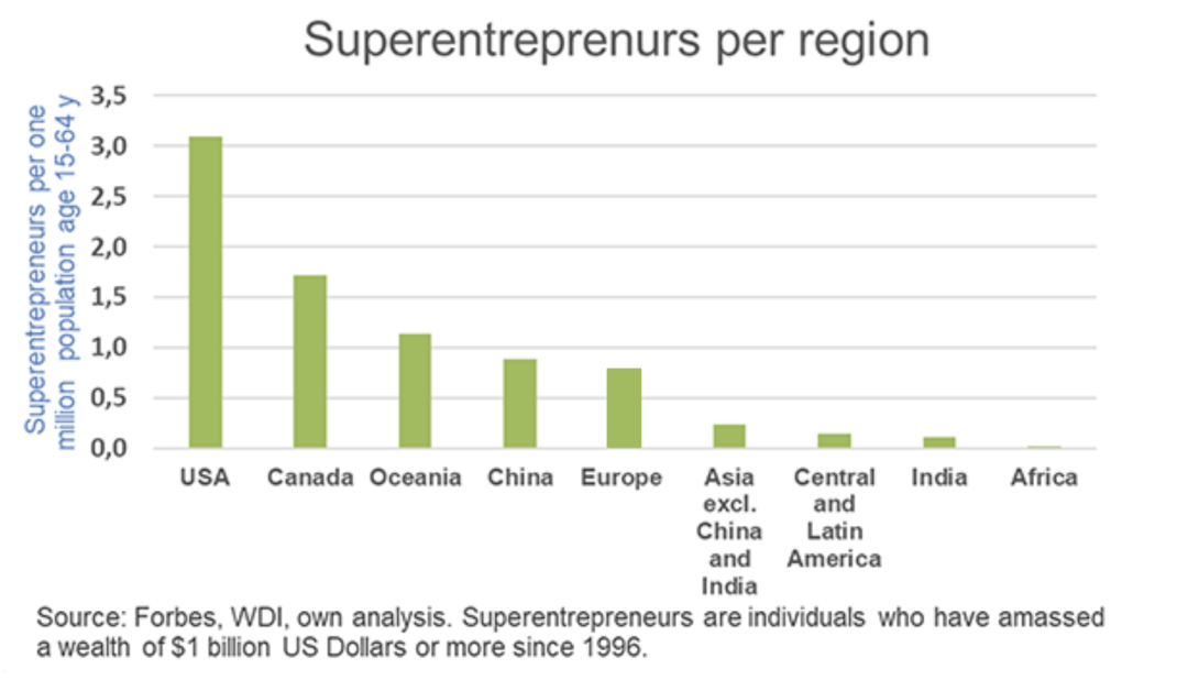 但放眼整个欧洲,每百万成年人中只有 0.8 名超级企业家——这只是美国的四分之一,中国的集中度也高于欧洲。为什么会这样?