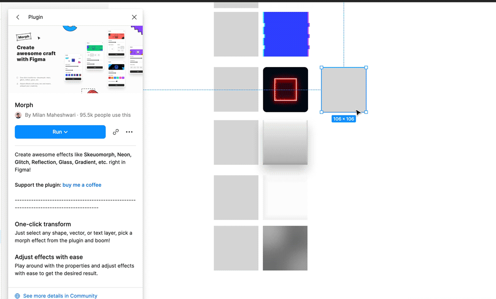 Figma插件安装非常方便,只需要在这里搜插件的名字然后点击Run就能装好并使用了。