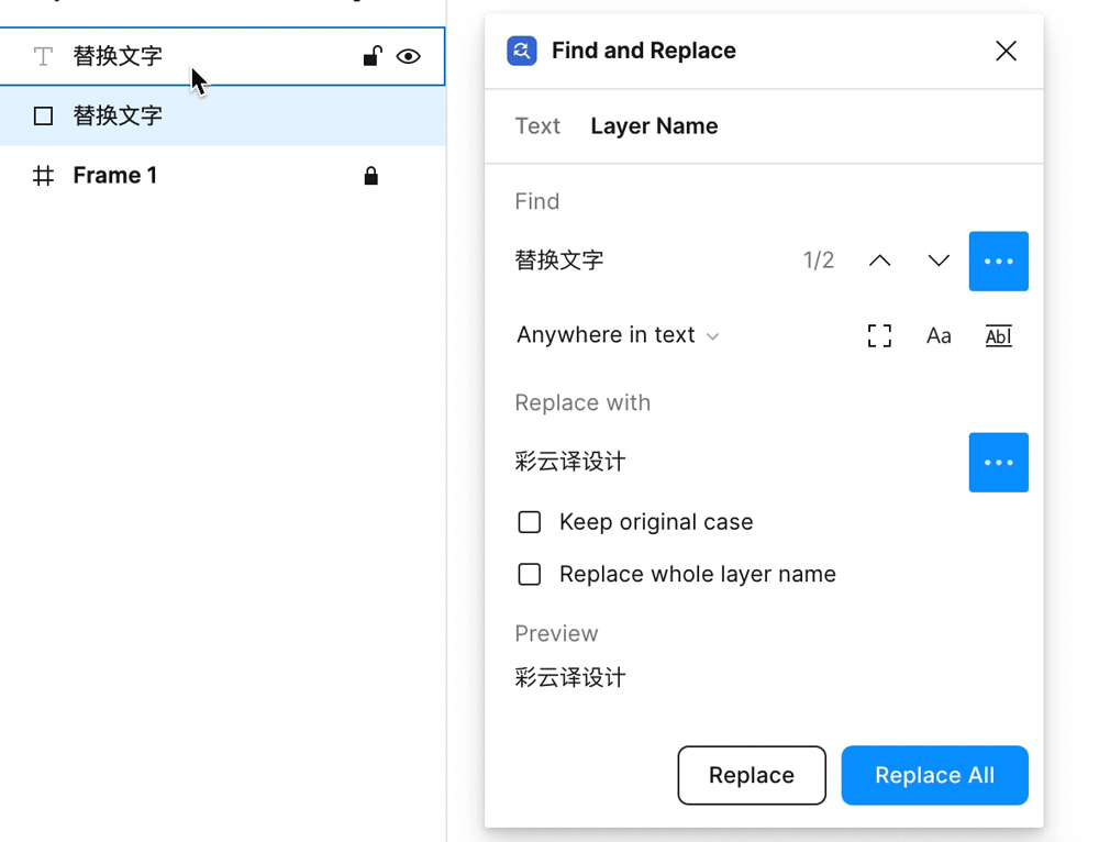当界面量很大,文本内容又非常多时,用这个基础的查找和替换插件便会非常实用。可以一次性换掉项目中所有需要替换的内容,包括图层名和内容文字。