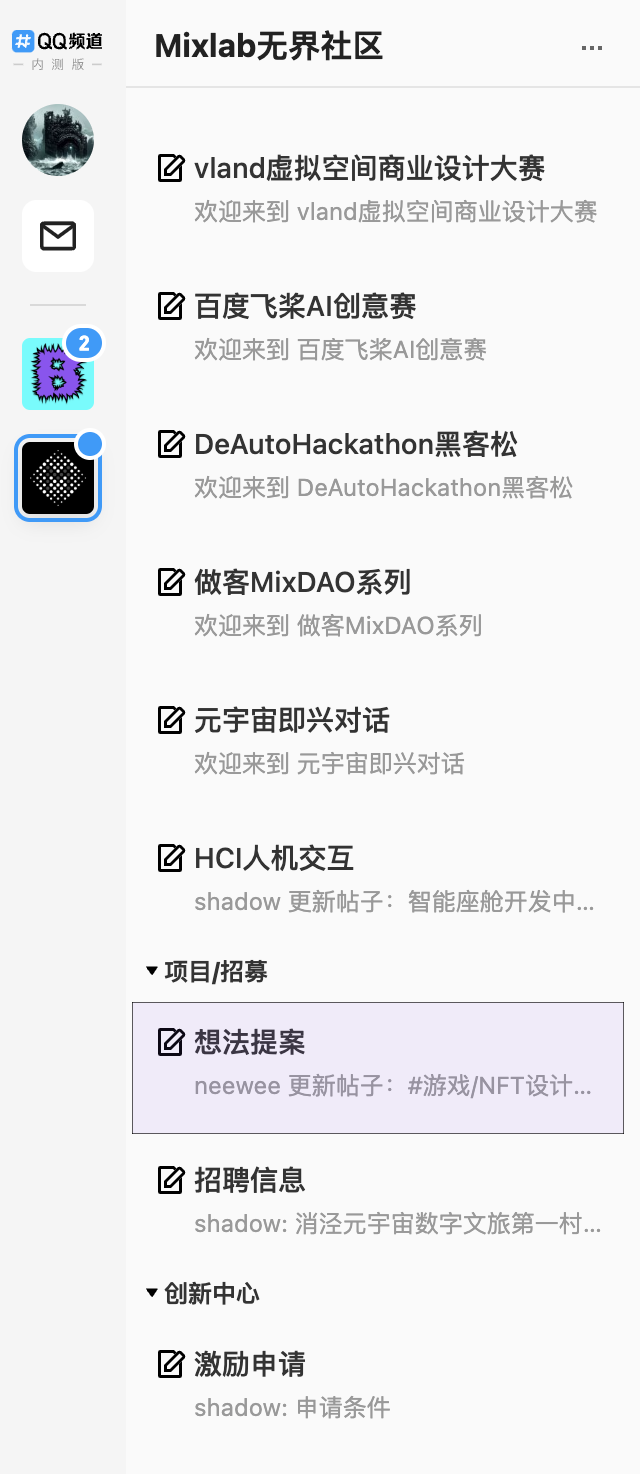 A:社群 QQ 频道中有想法提案区,社群成员可以发起活动,招募队友。无论是比赛、个人兴趣项目还是话题讨论都可以在此发起提案。