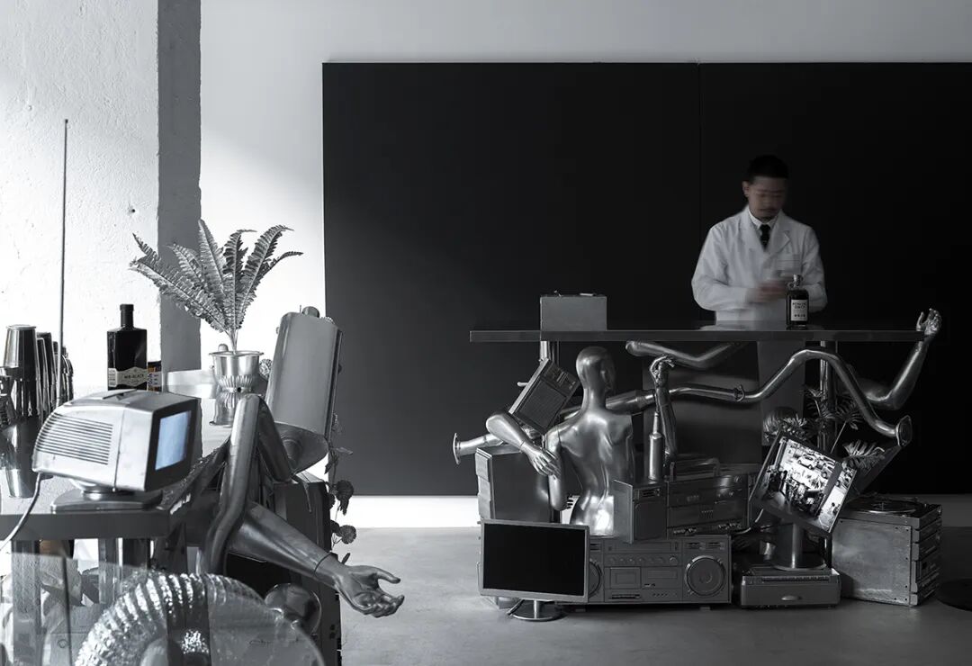 最熟悉的东西便是最未知的,我们将收集来的物件(情绪碎片)整理罗列,任其自由生长。并将生活物品的碎片信息全部处理成统一材质——金属质感,营造出熟悉的陌生感。监控影像是来自空间内的窥视、和来自自己的审视。金属与黑色的强烈碰撞配合着空间内的监控影响,塑造了来自未知的不安情绪。我们希望这个空间成为一个有着强烈理念的装置,使人进入场域便感受到设计与品牌所揭示的内核。