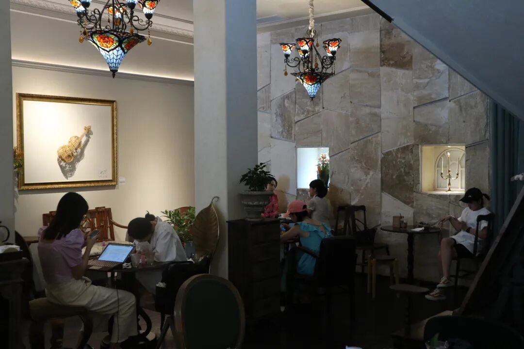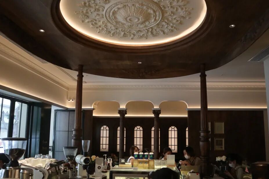 咖啡厅内部的空间充分还原了典雅别致的法式生活场景。不论是抬头就能看见的欧式古典风格天花板,还是从各地淘来的各种复古家具,一走近店内,就会被精致的装修所吸引。
